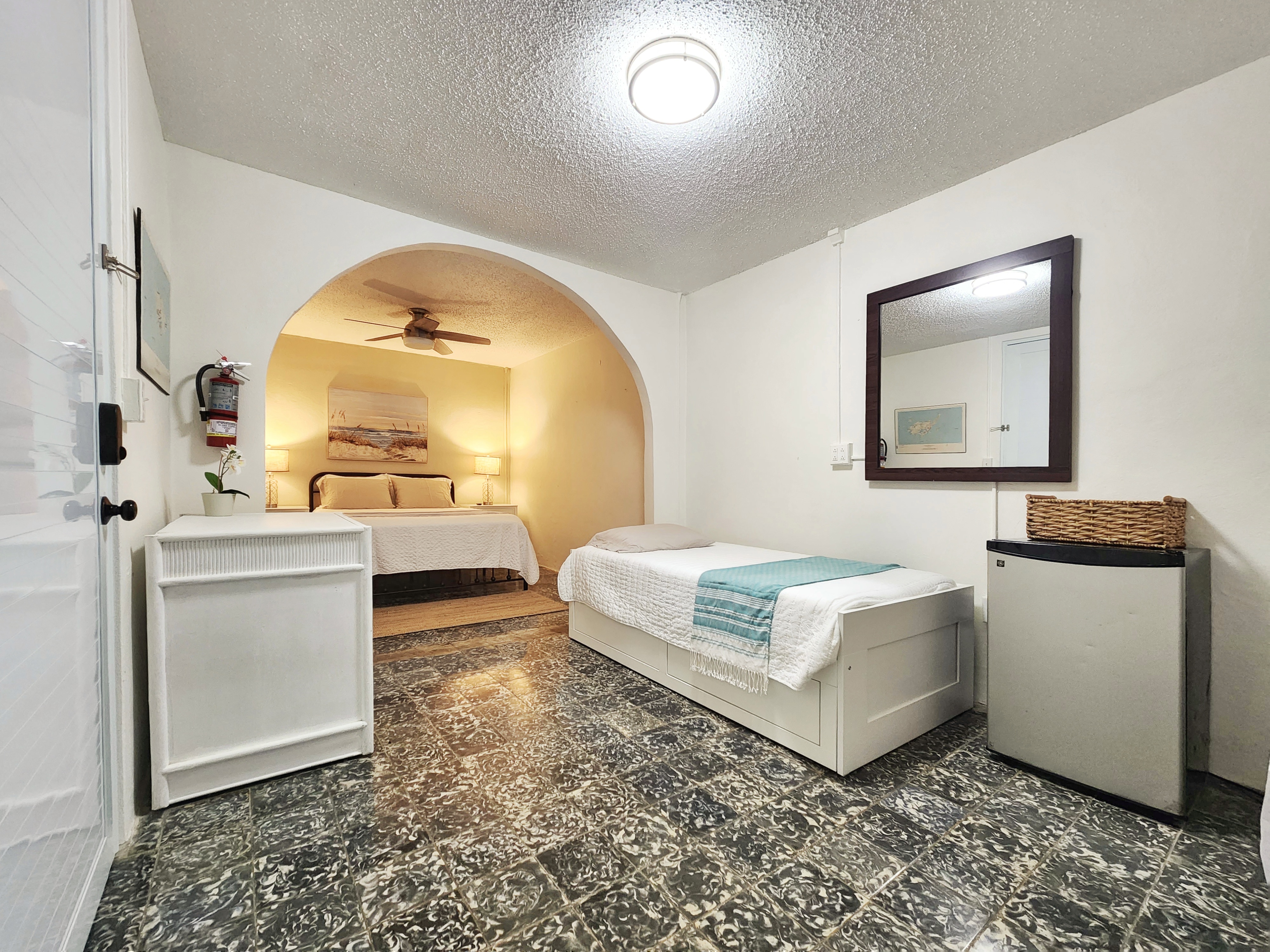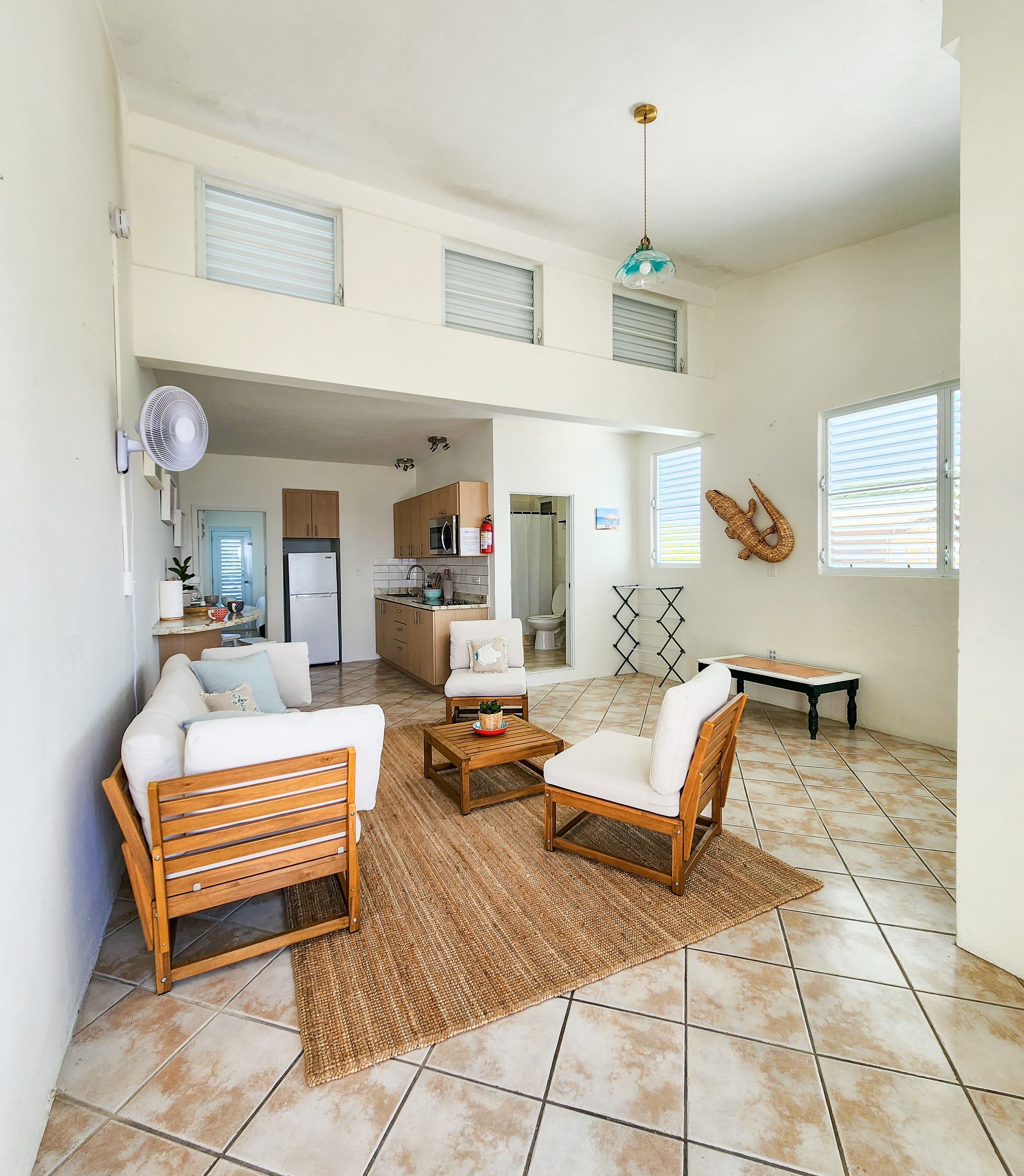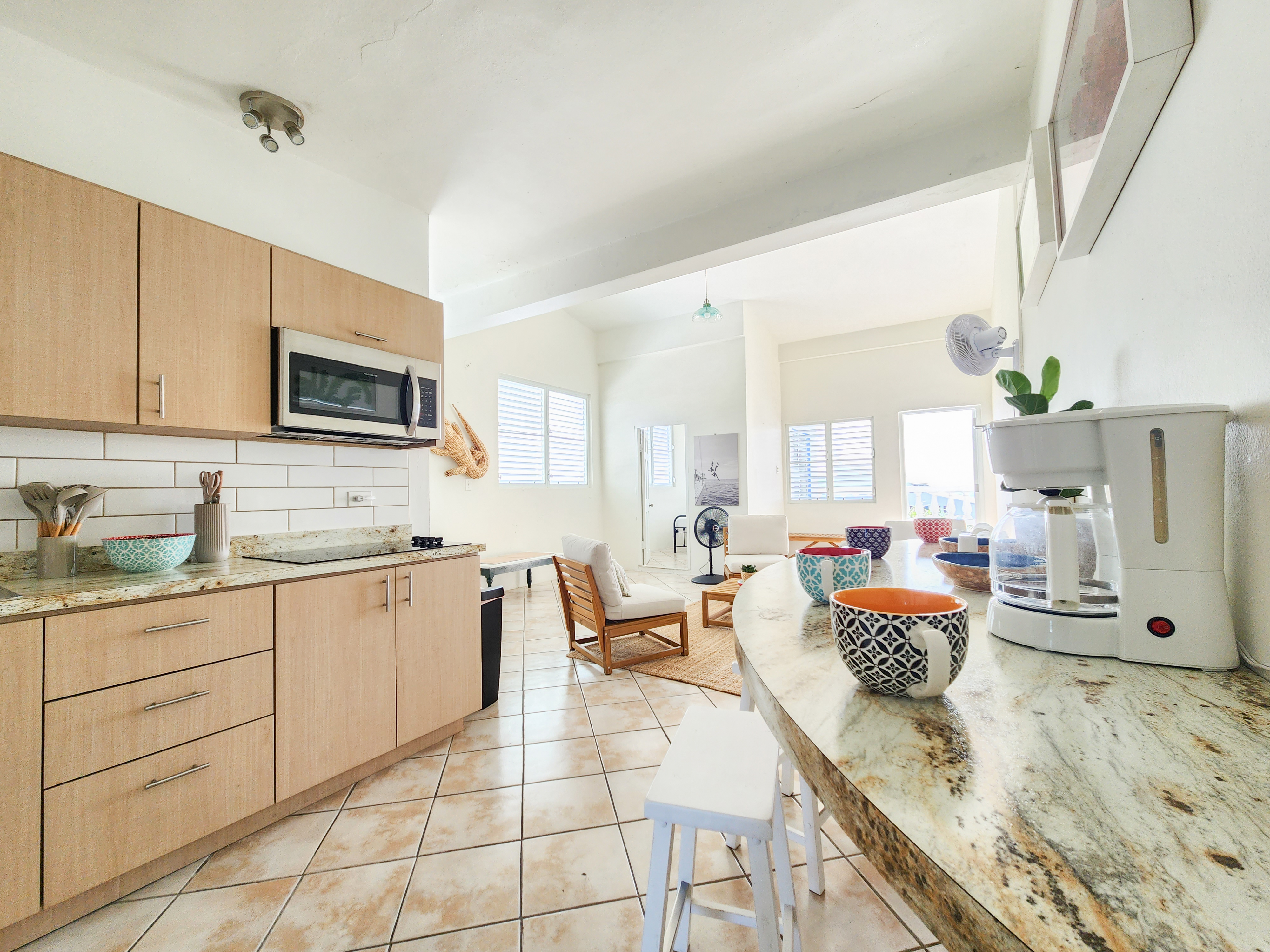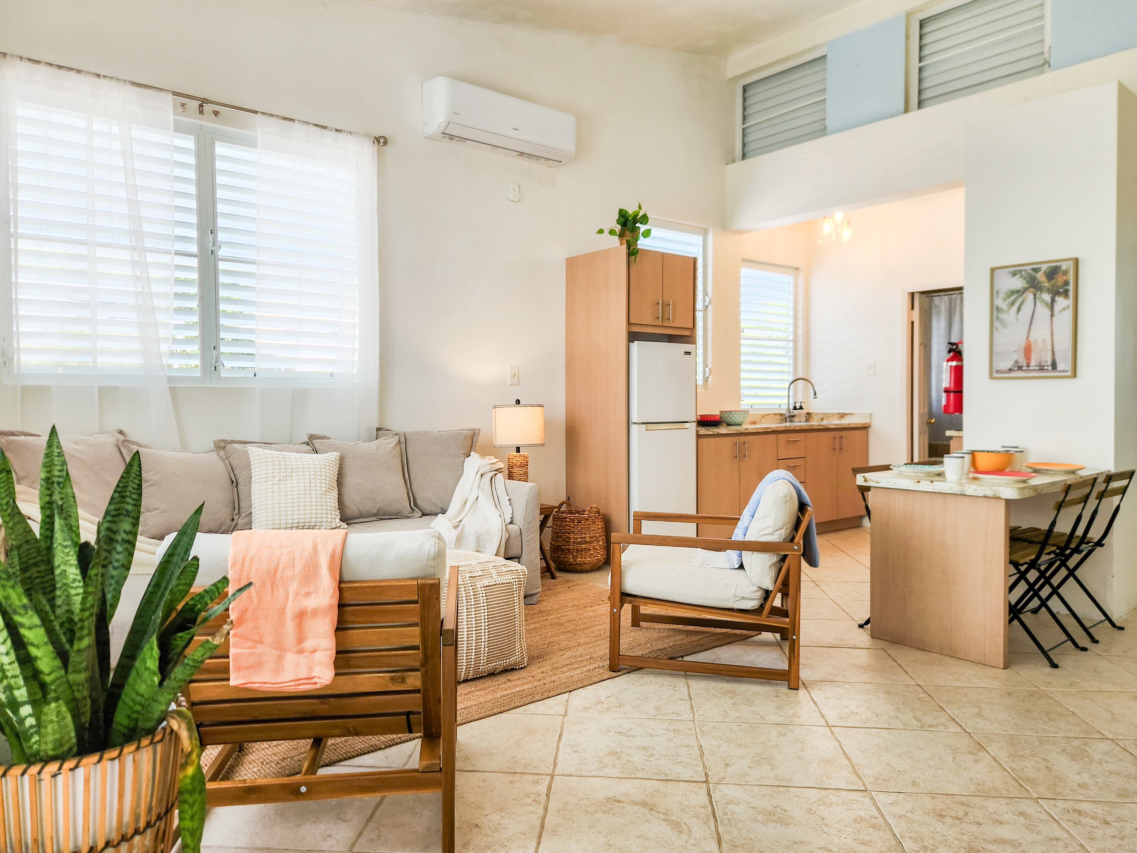 Penthouse Apartment 10 is a spacious suite ideal for larger groups. It features one queen bedroom, a kitchen, a living area, a full bathroom, a shared terrace with an ocean view, and a private balcony with ocean view. The suite sleeps up to 6 adults: 2 in the queen bedroom and 4 in the living area with a sofa bed and two twin beds.