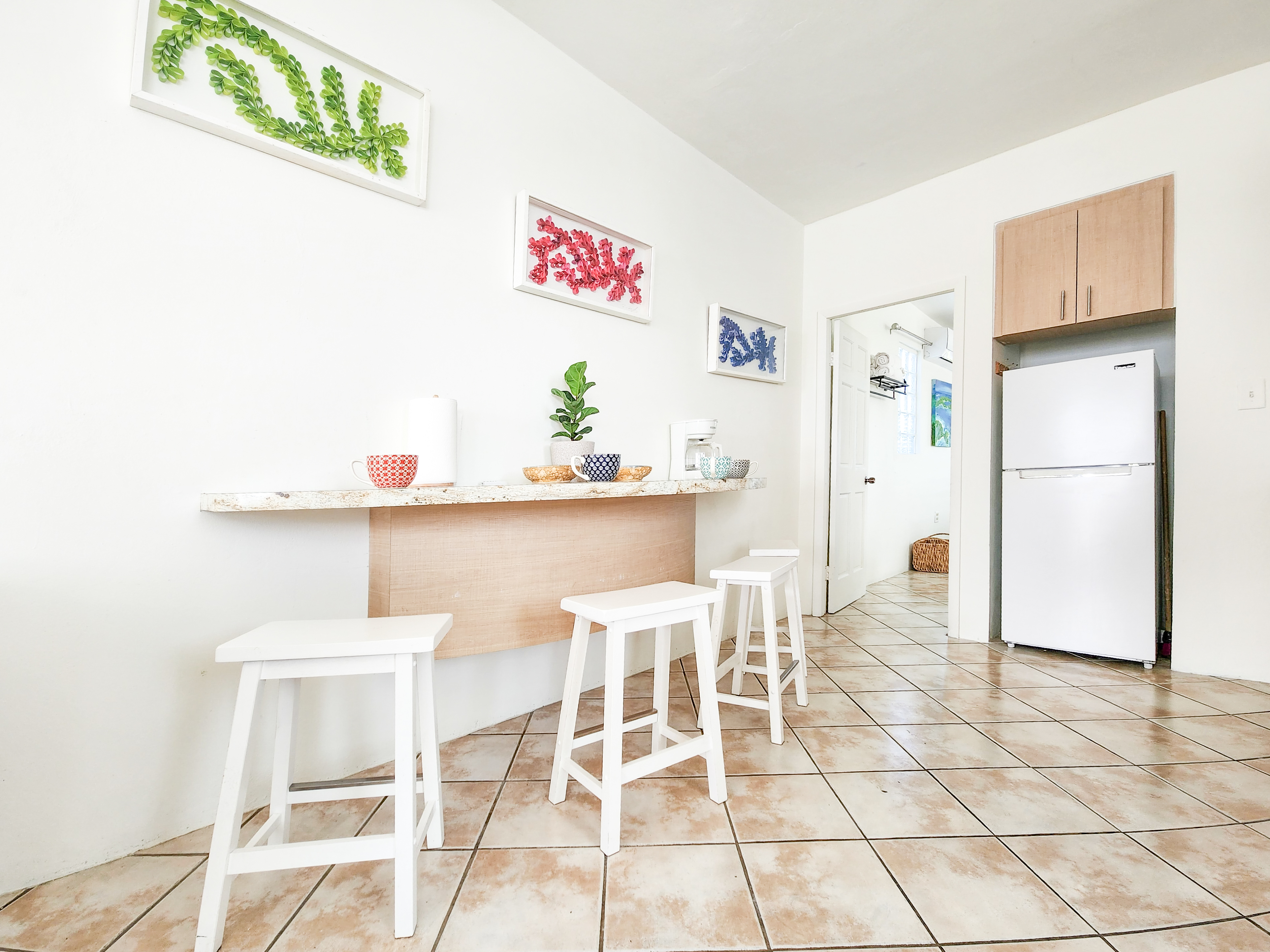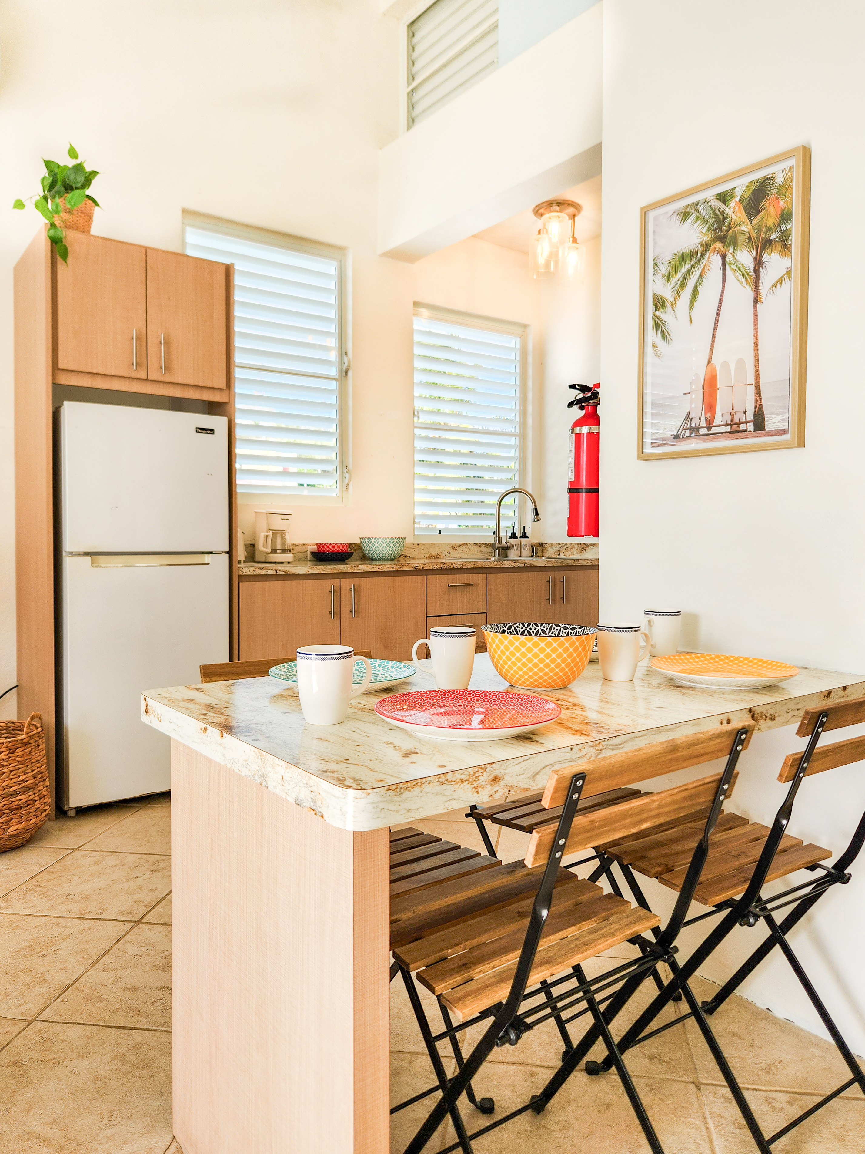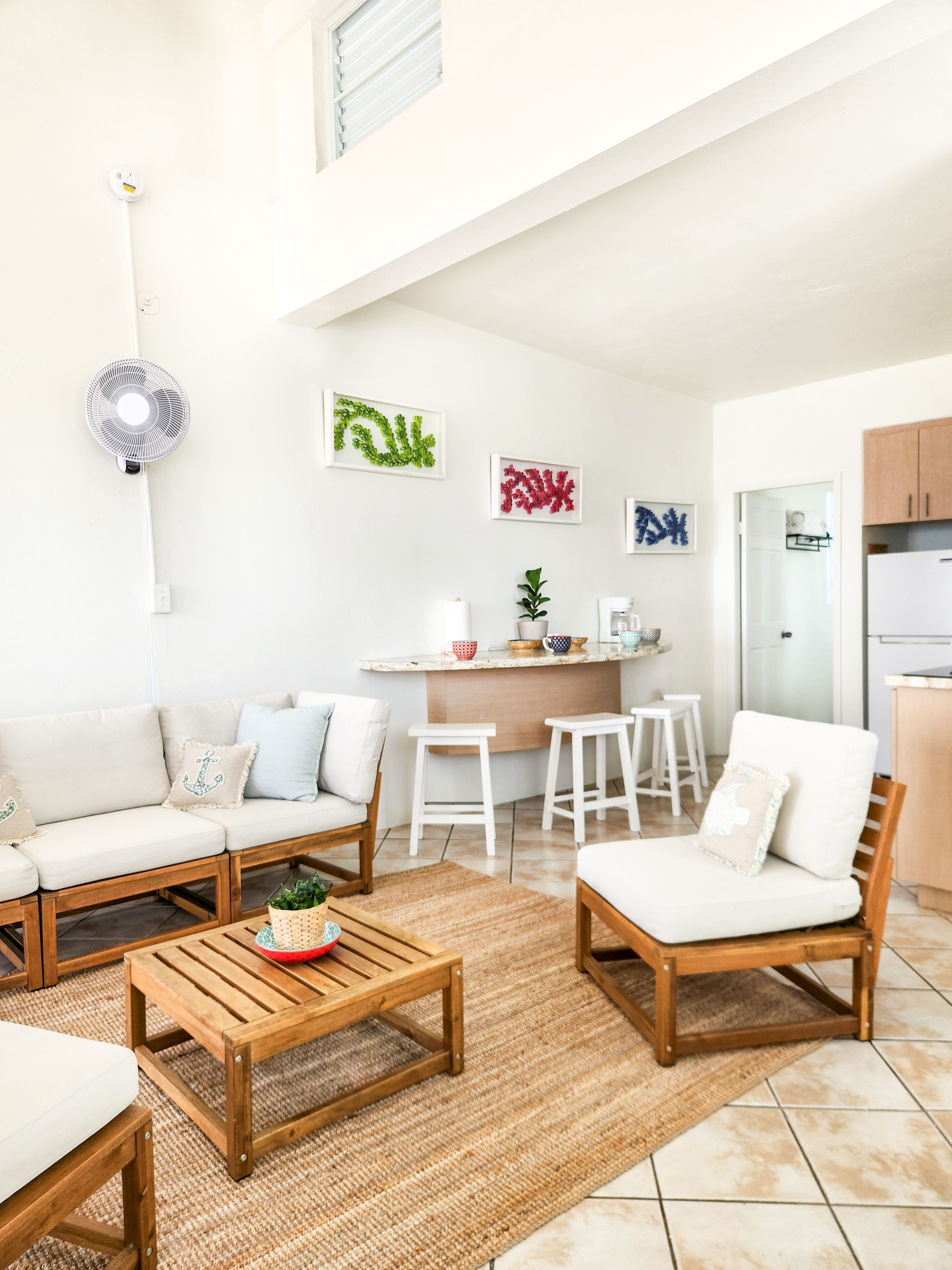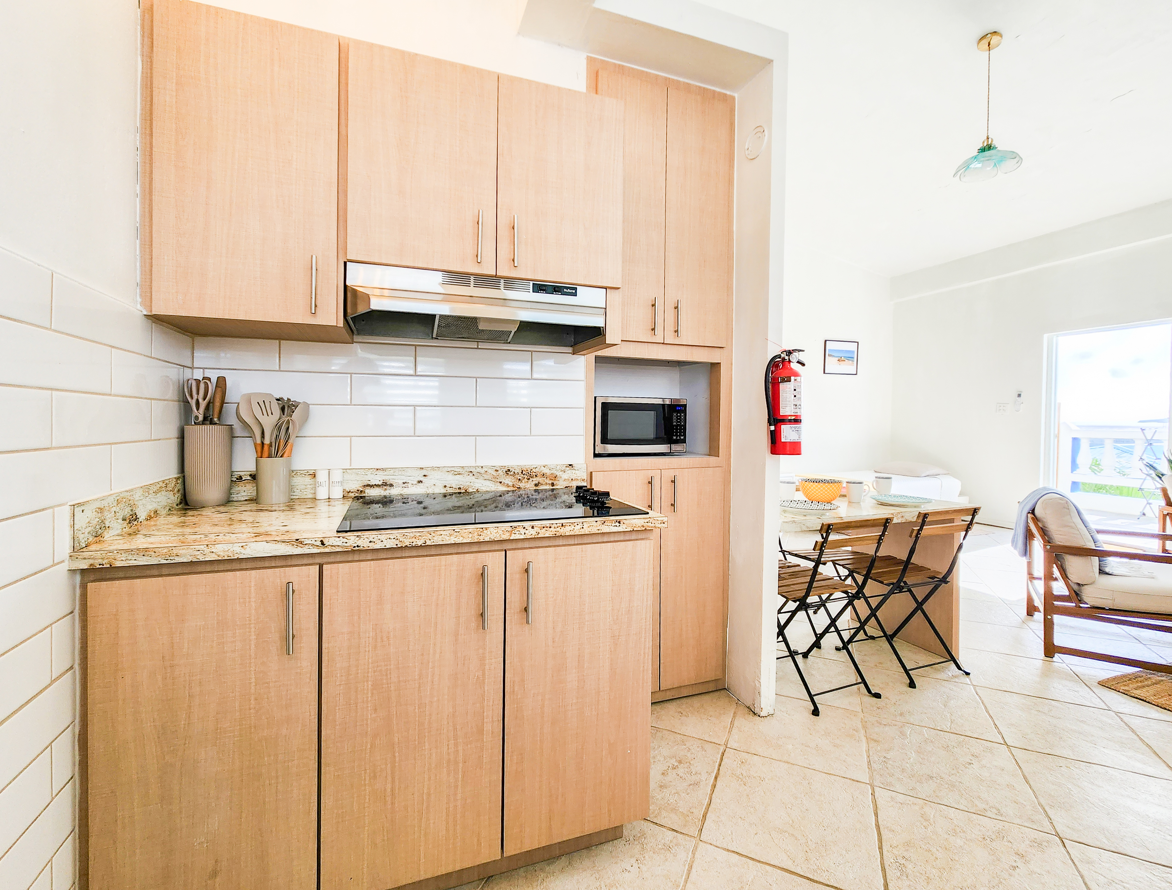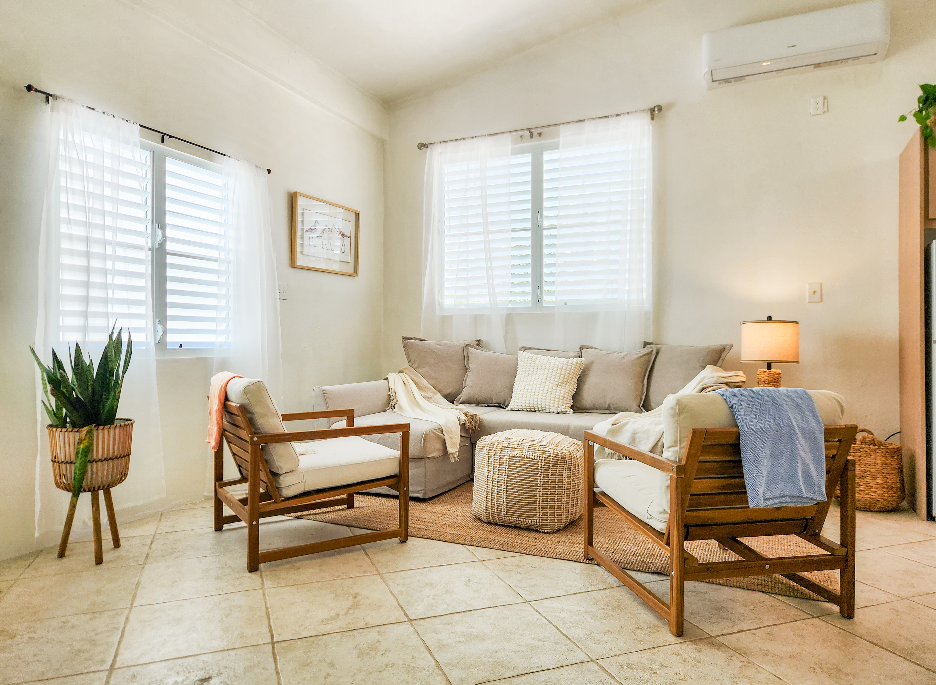 Penthouse Apartment 10 is a spacious suite ideal for larger groups. It features one queen bedroom, a kitchen, a living area, a full bathroom, a shared terrace with an ocean view, and a private balcony with ocean view. The suite sleeps up to 6 adults: 2 in the queen bedroom and 4 in the living area with a sofa bed and two twin beds.
