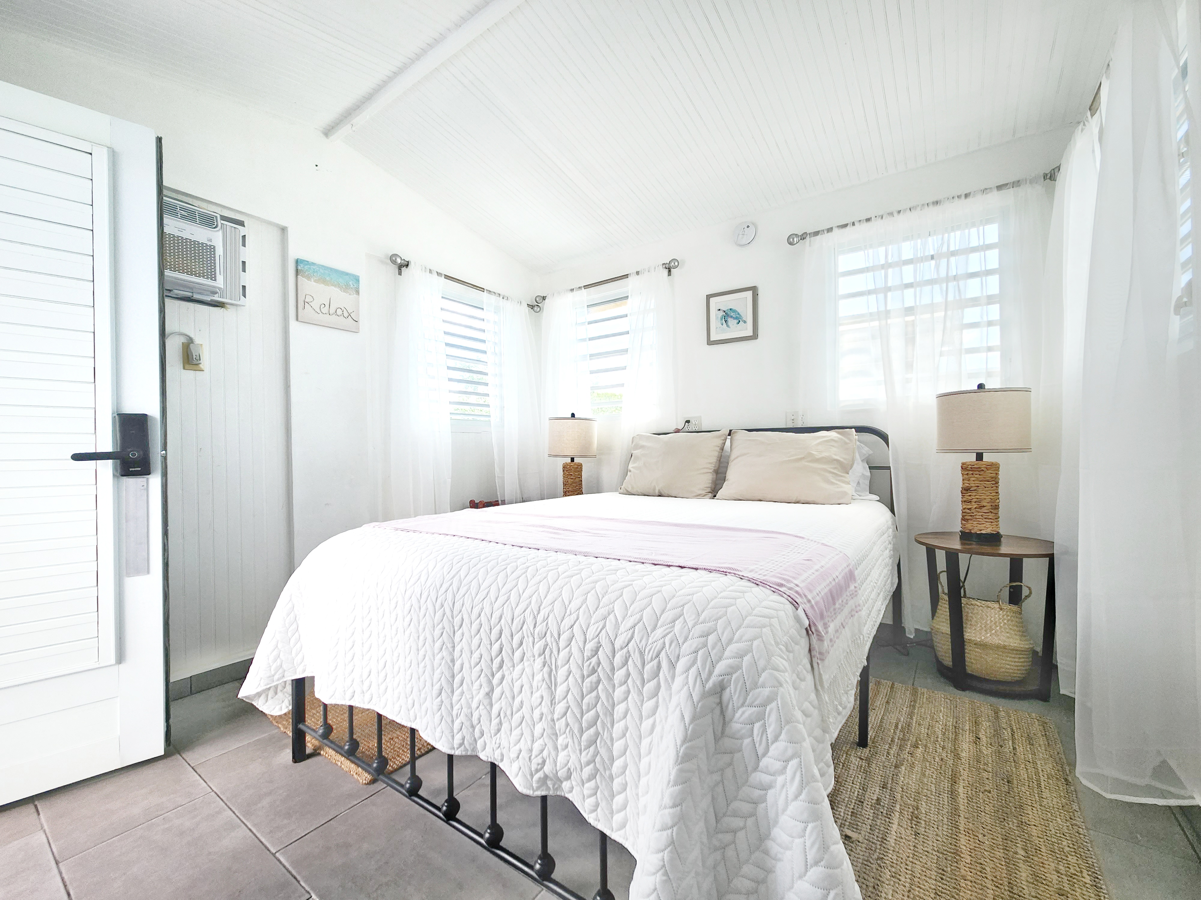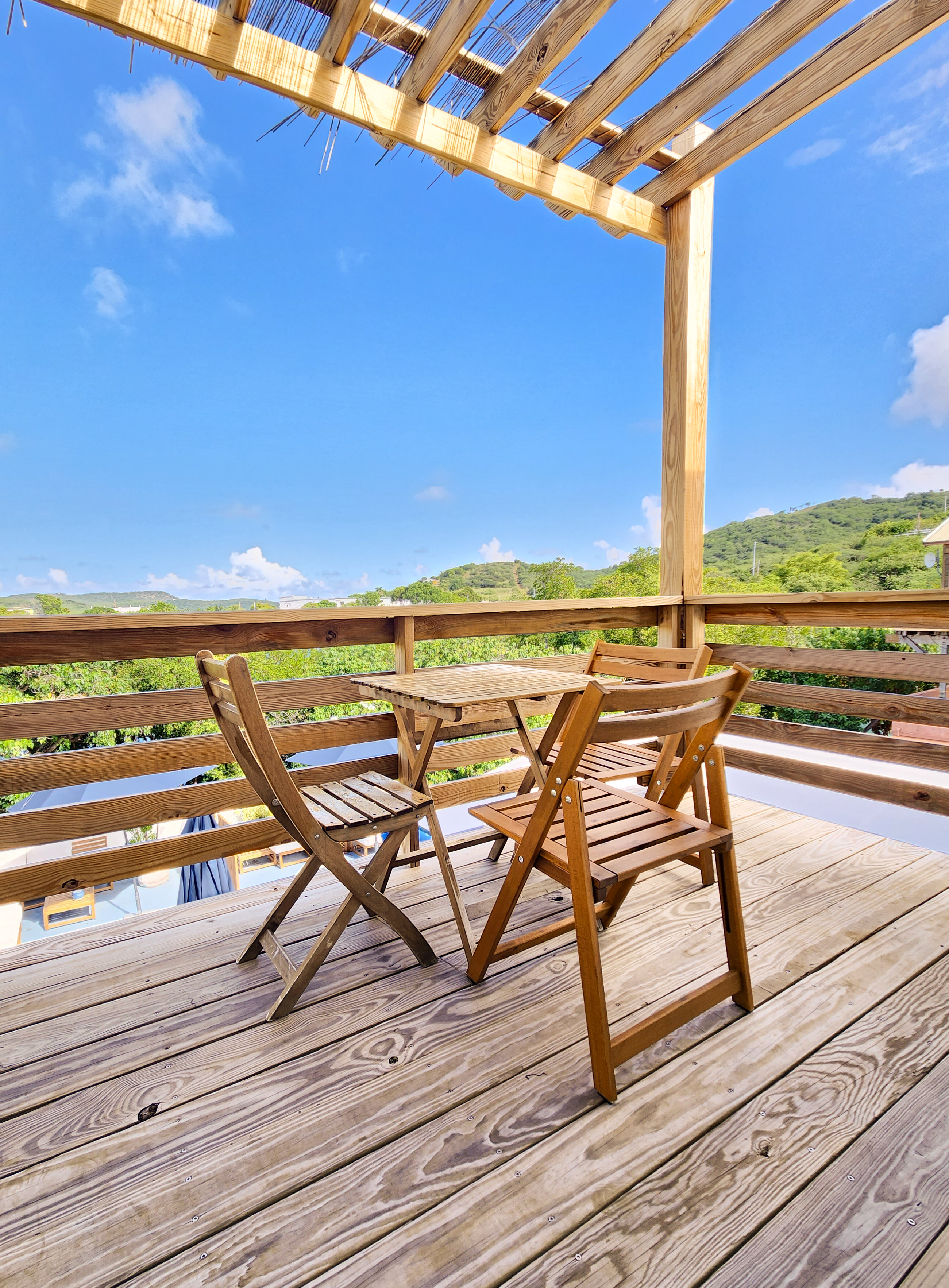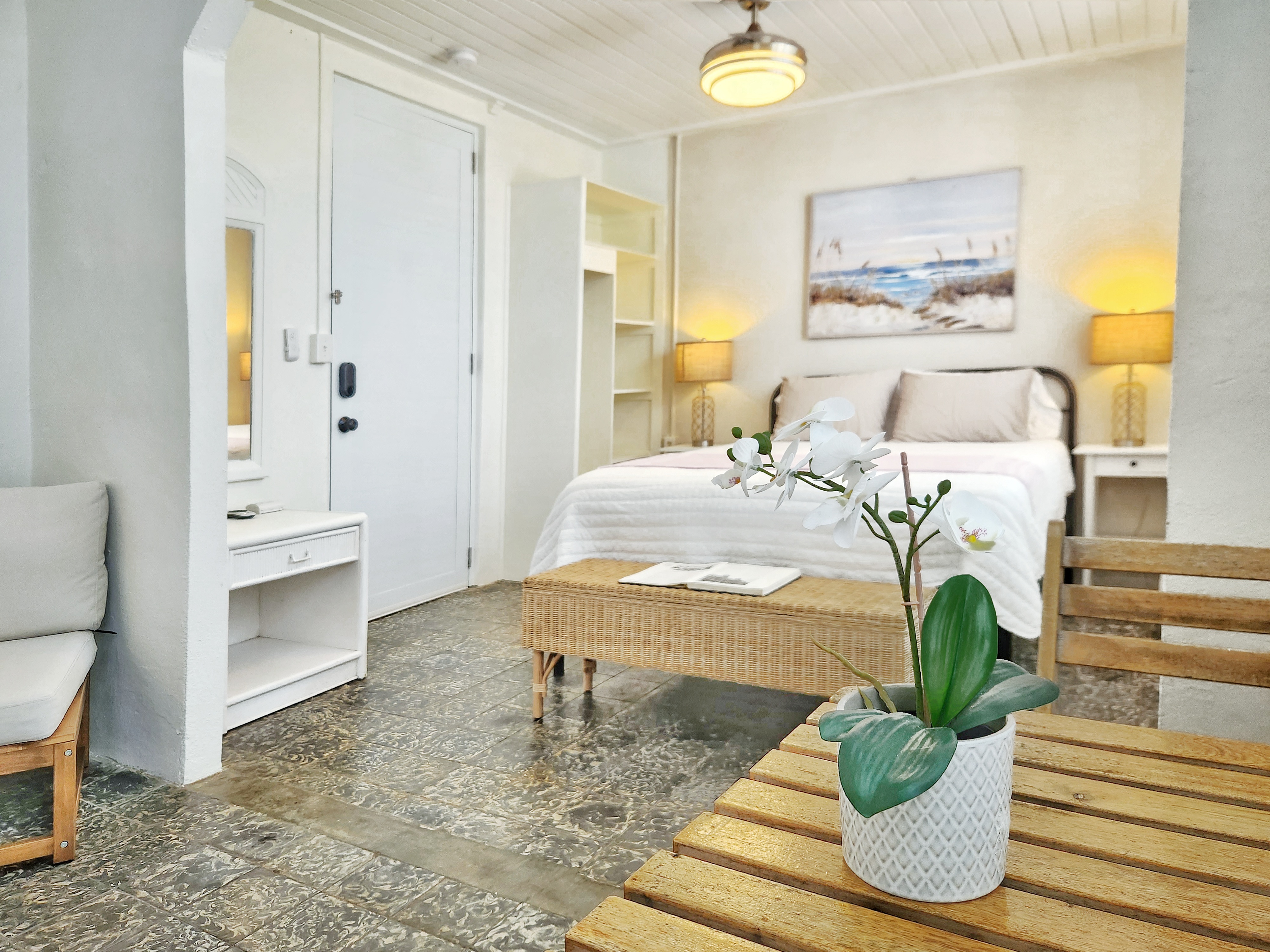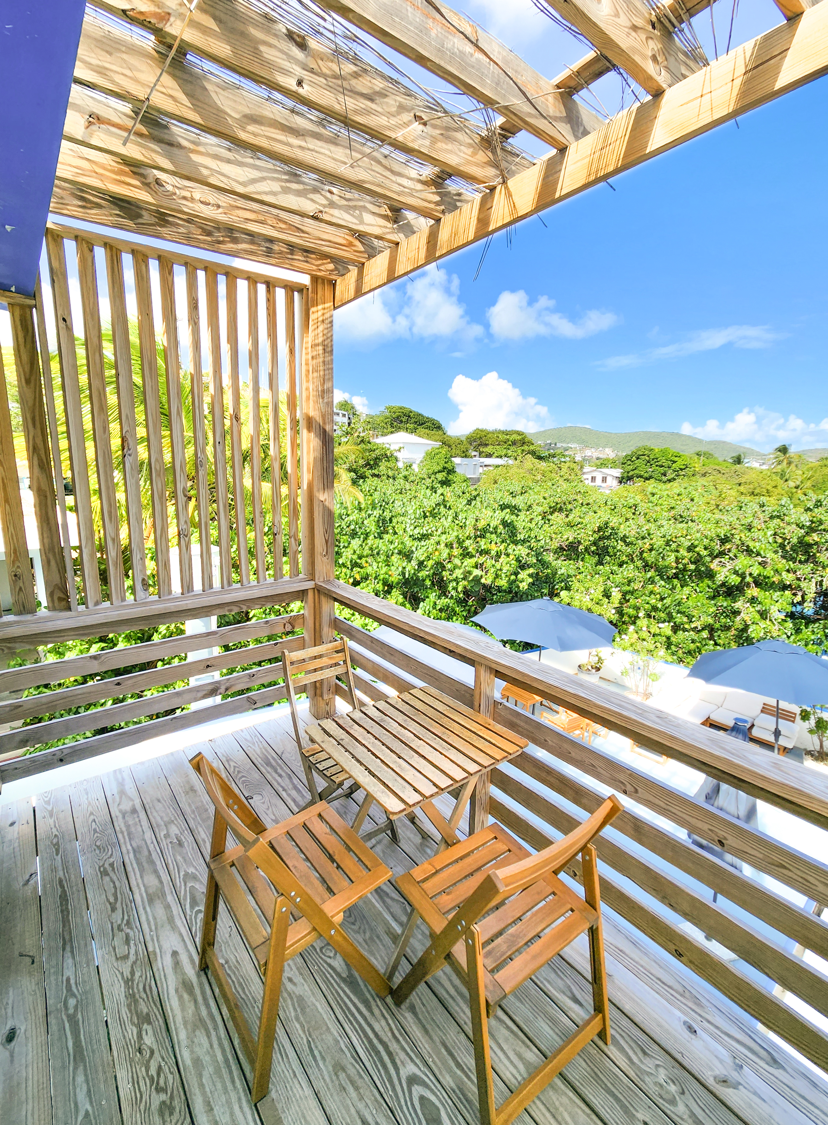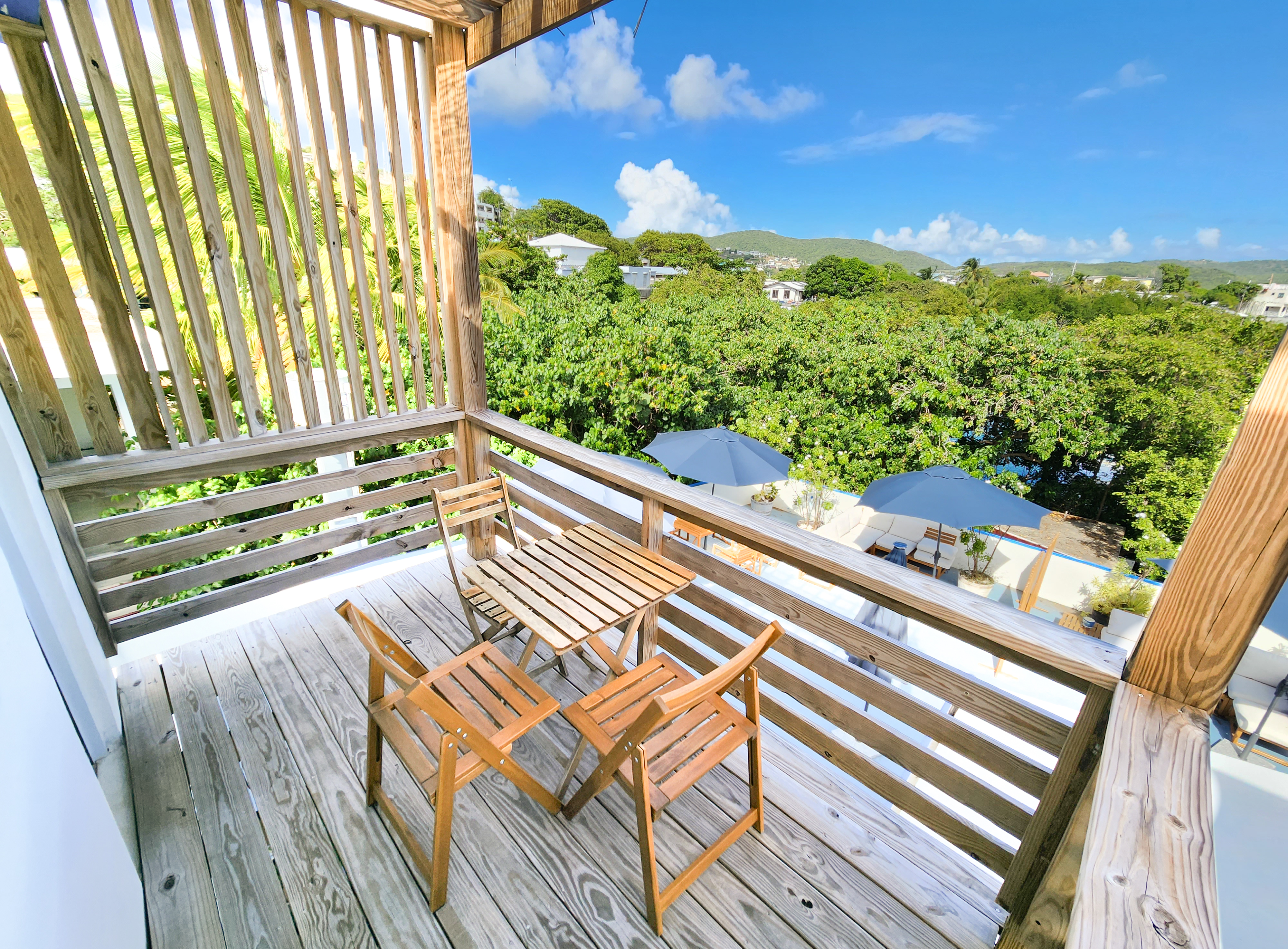 A deluxe queen room that opens out onto the spacious second floor terrace.