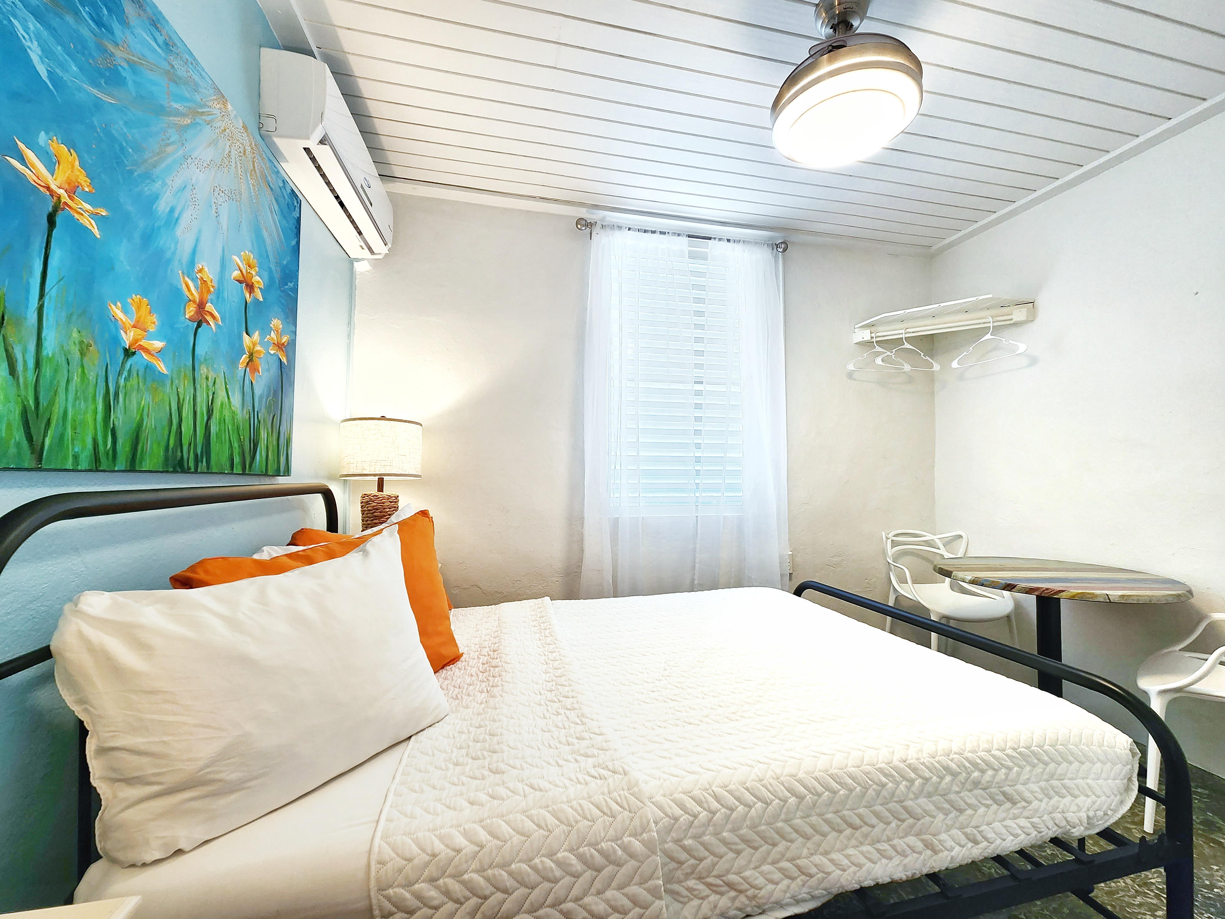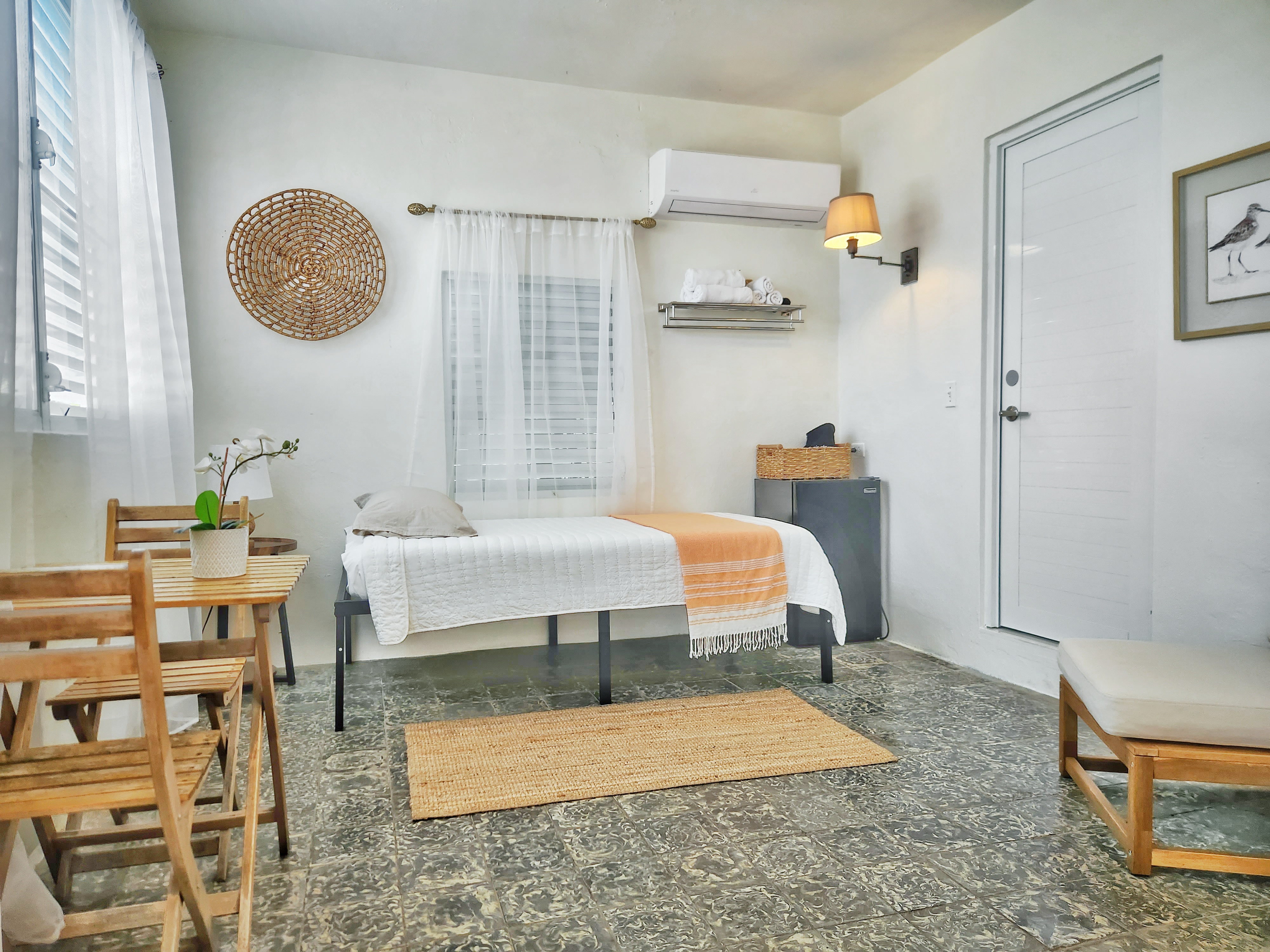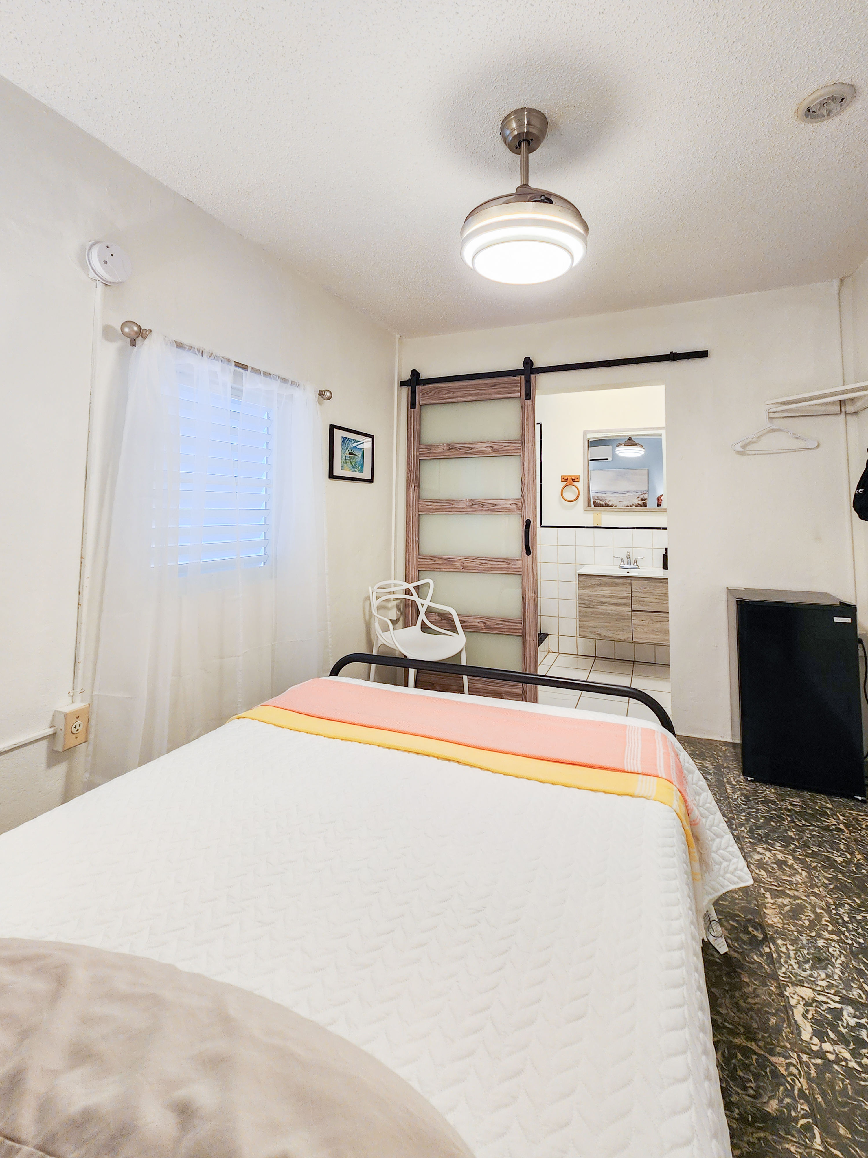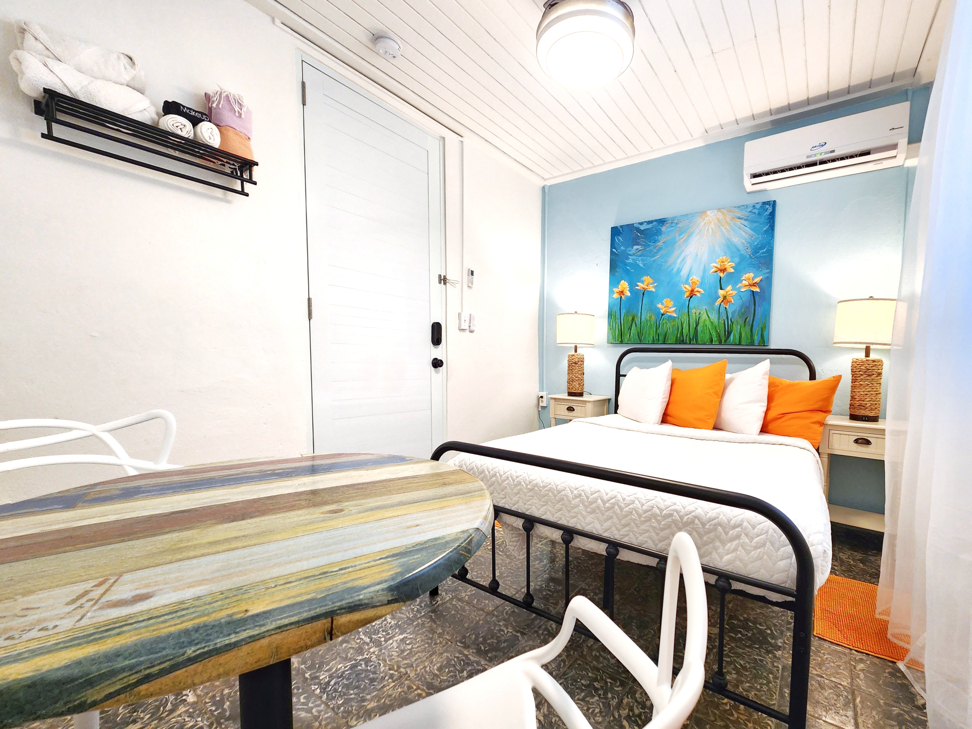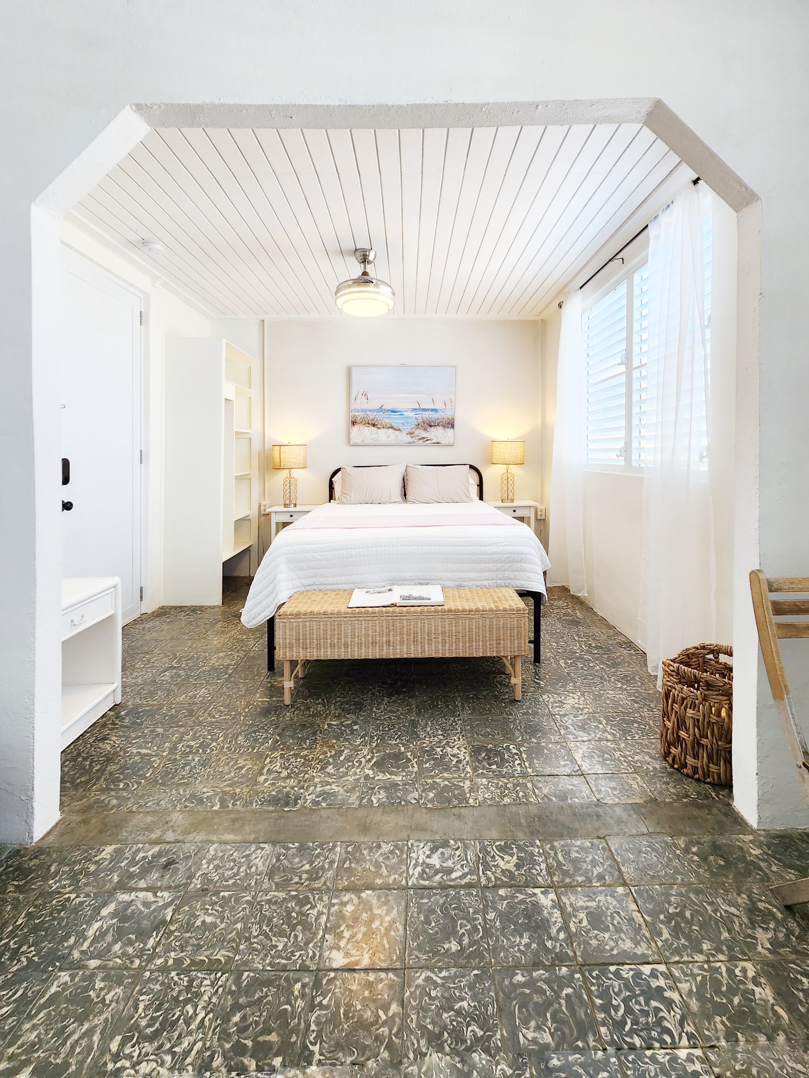 A deluxe queen room that opens out onto the spacious second floor terrace.