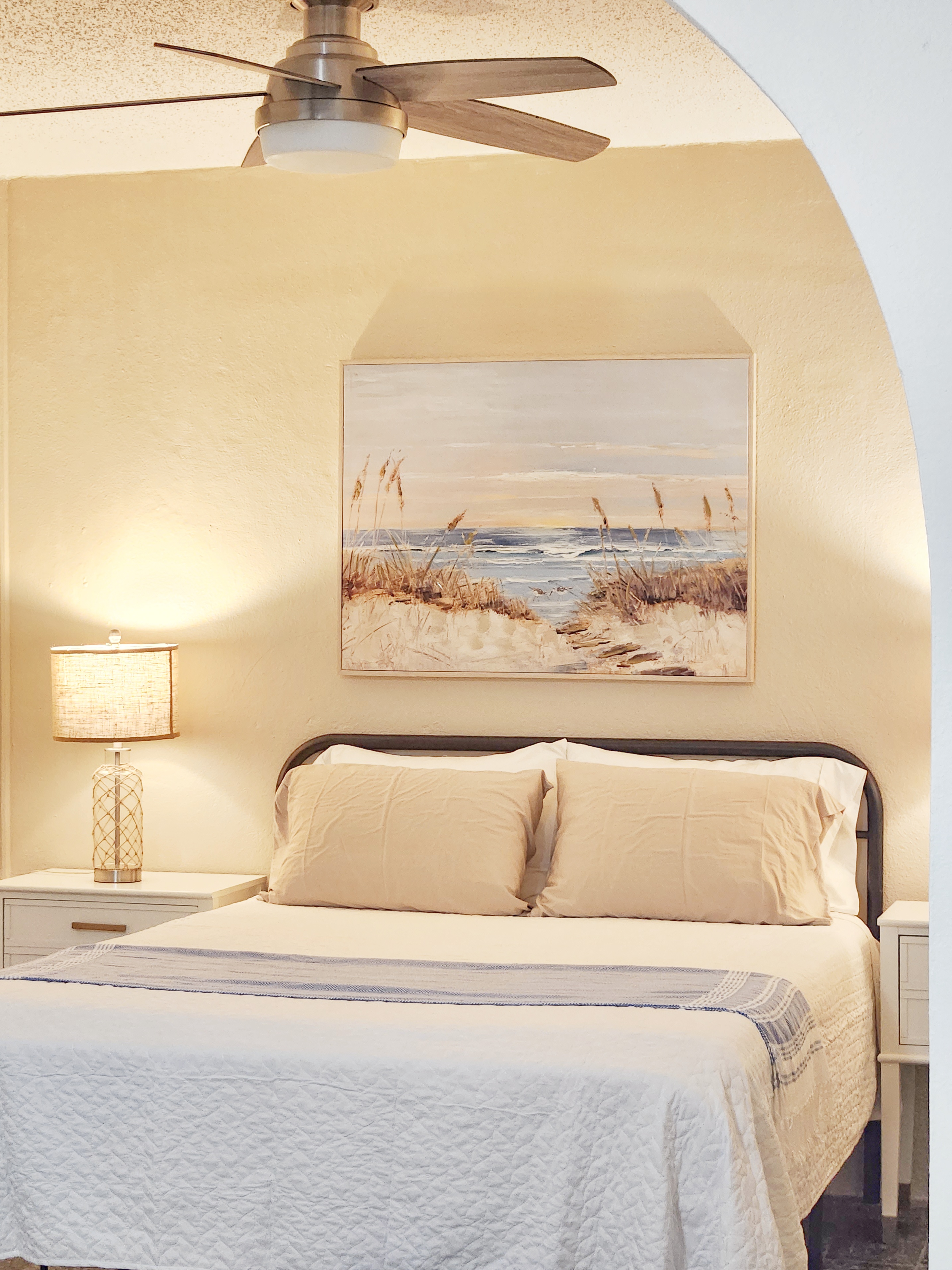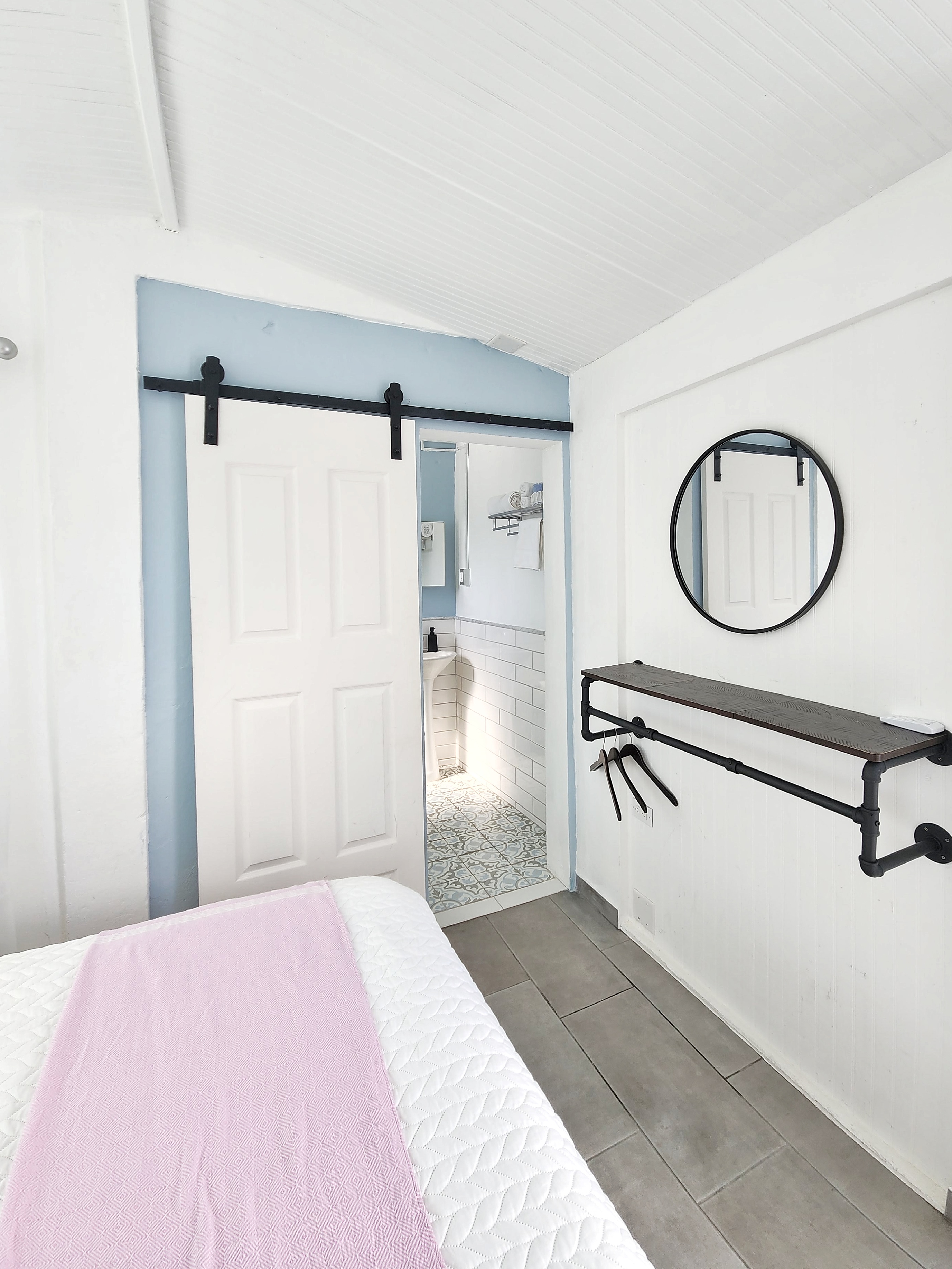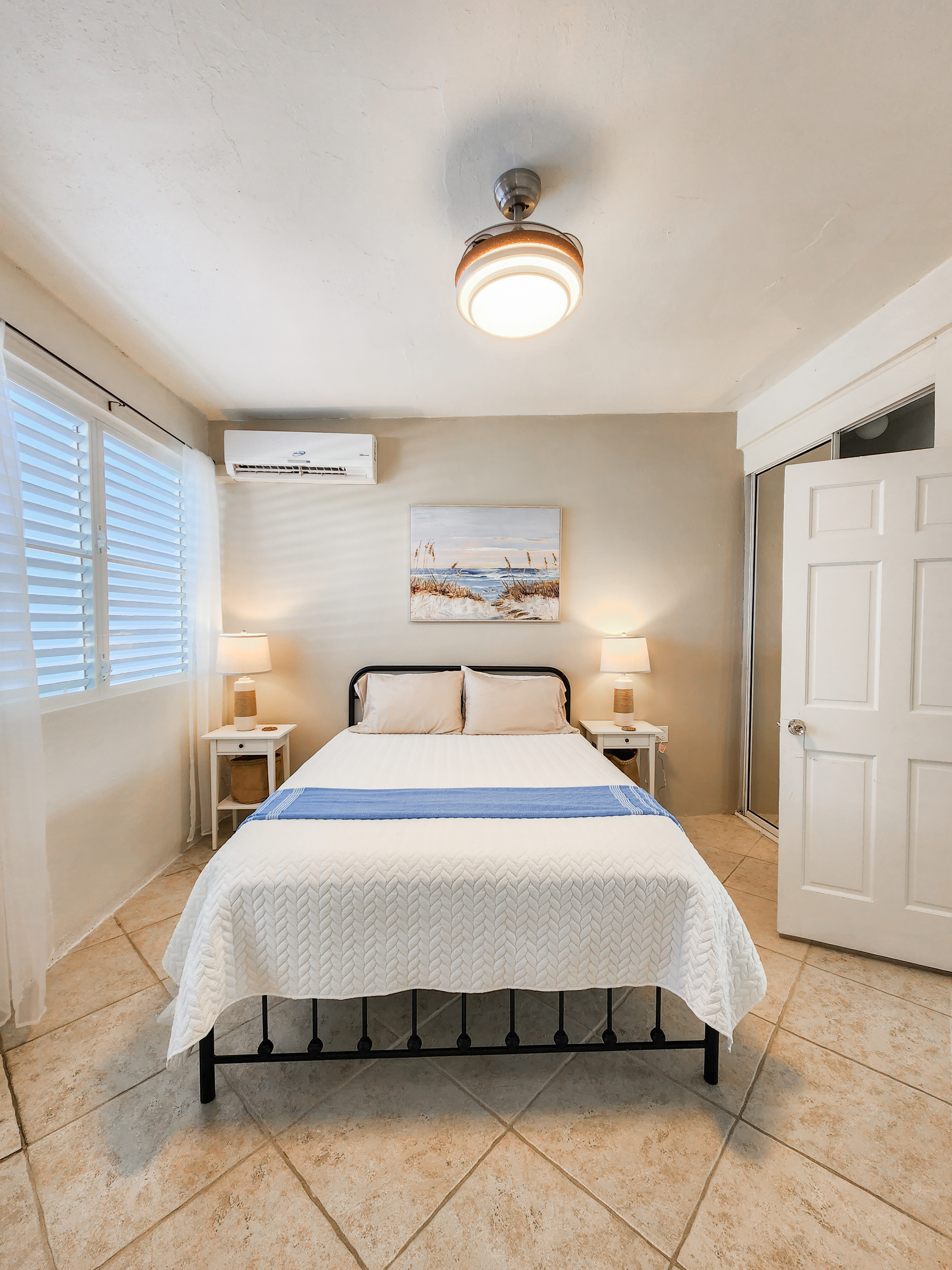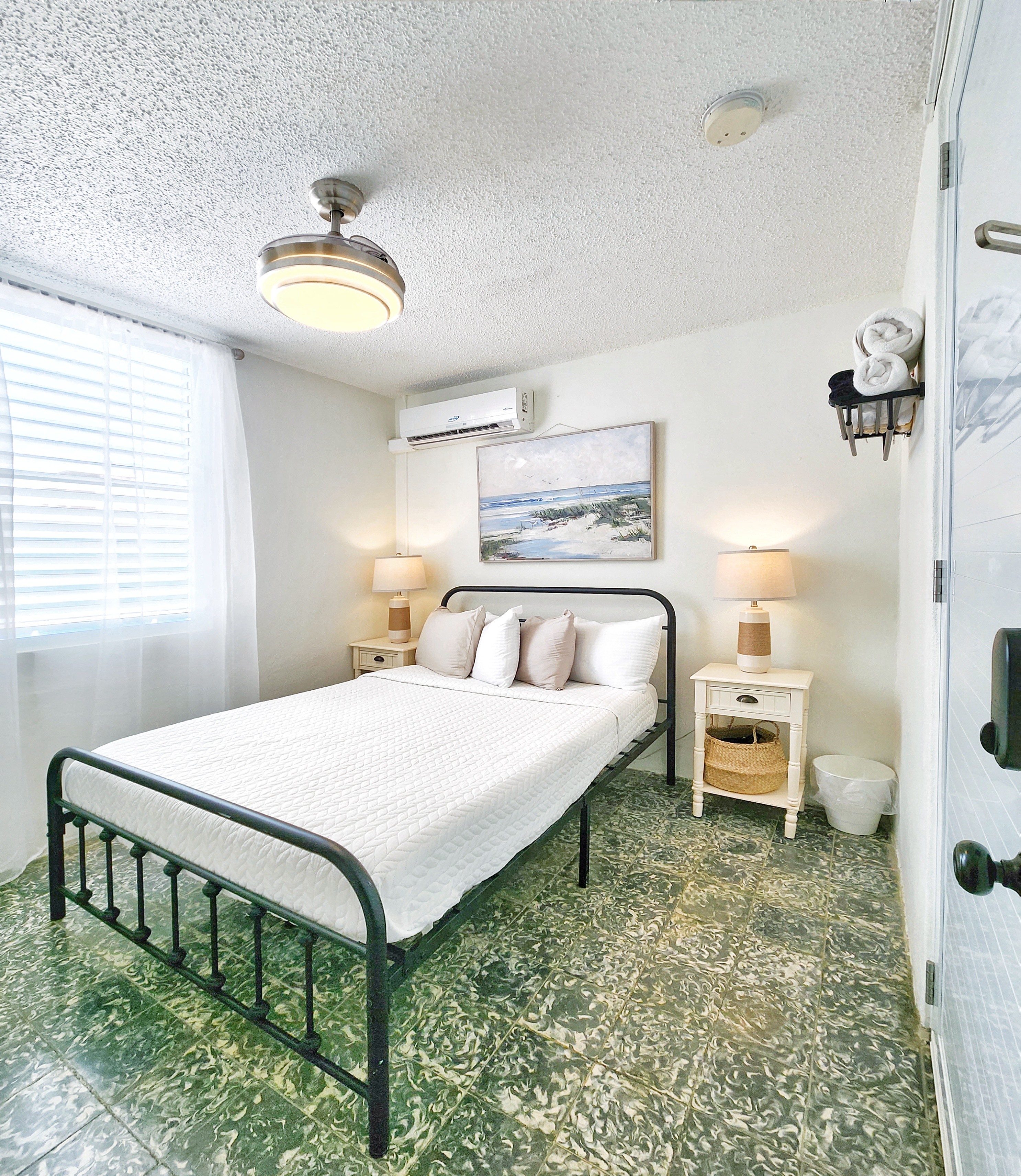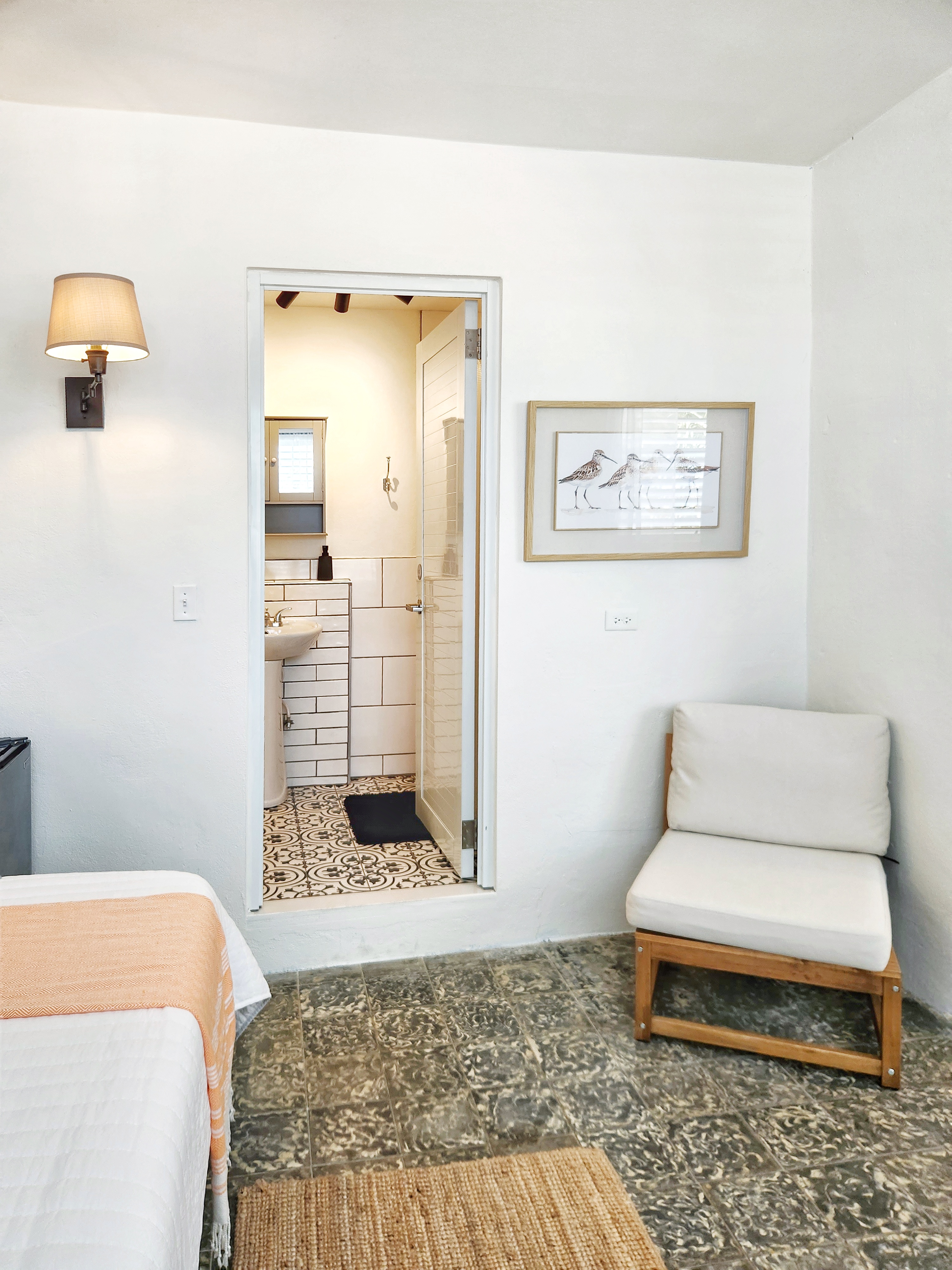 A deluxe queen room that opens out onto the spacious second floor terrace.
