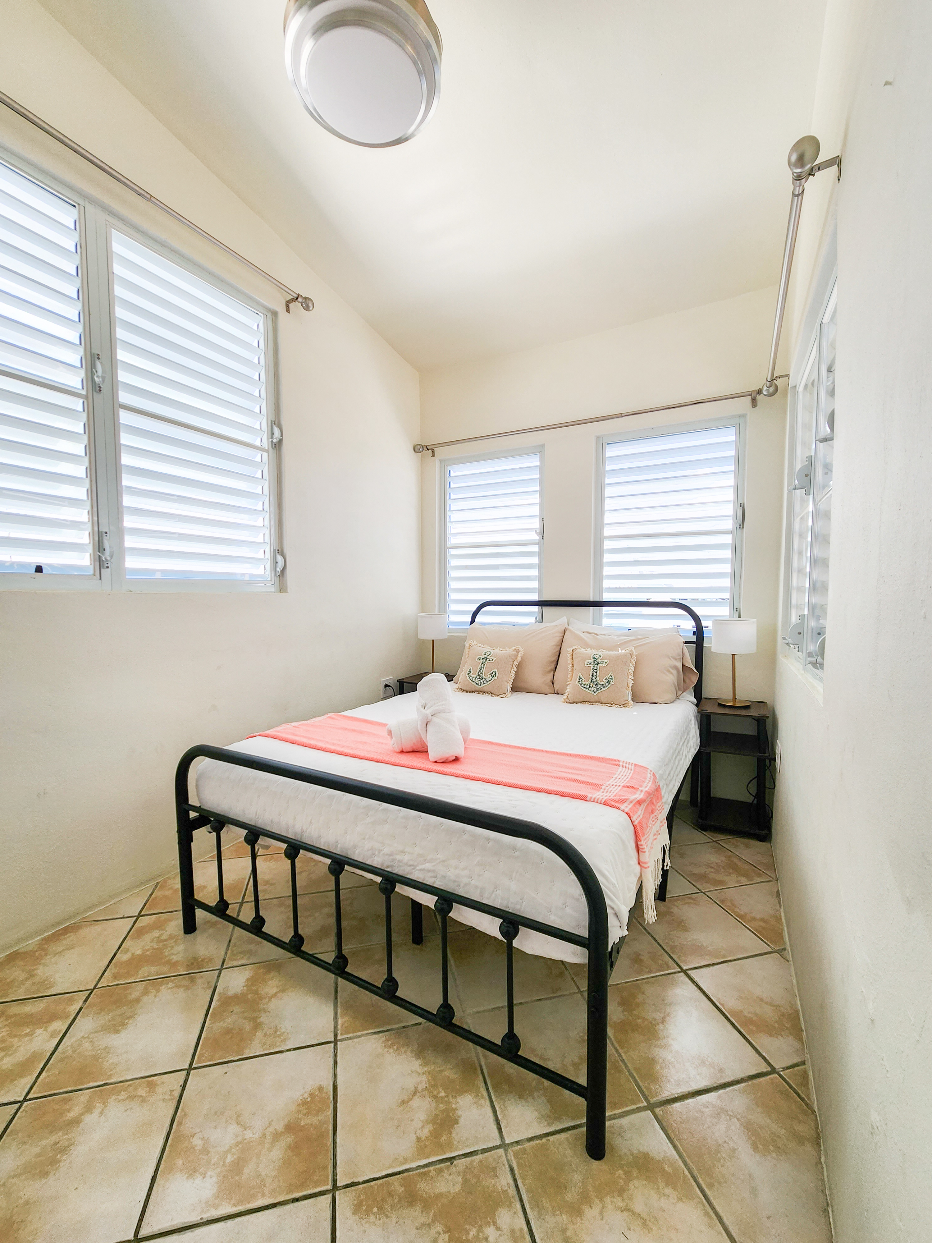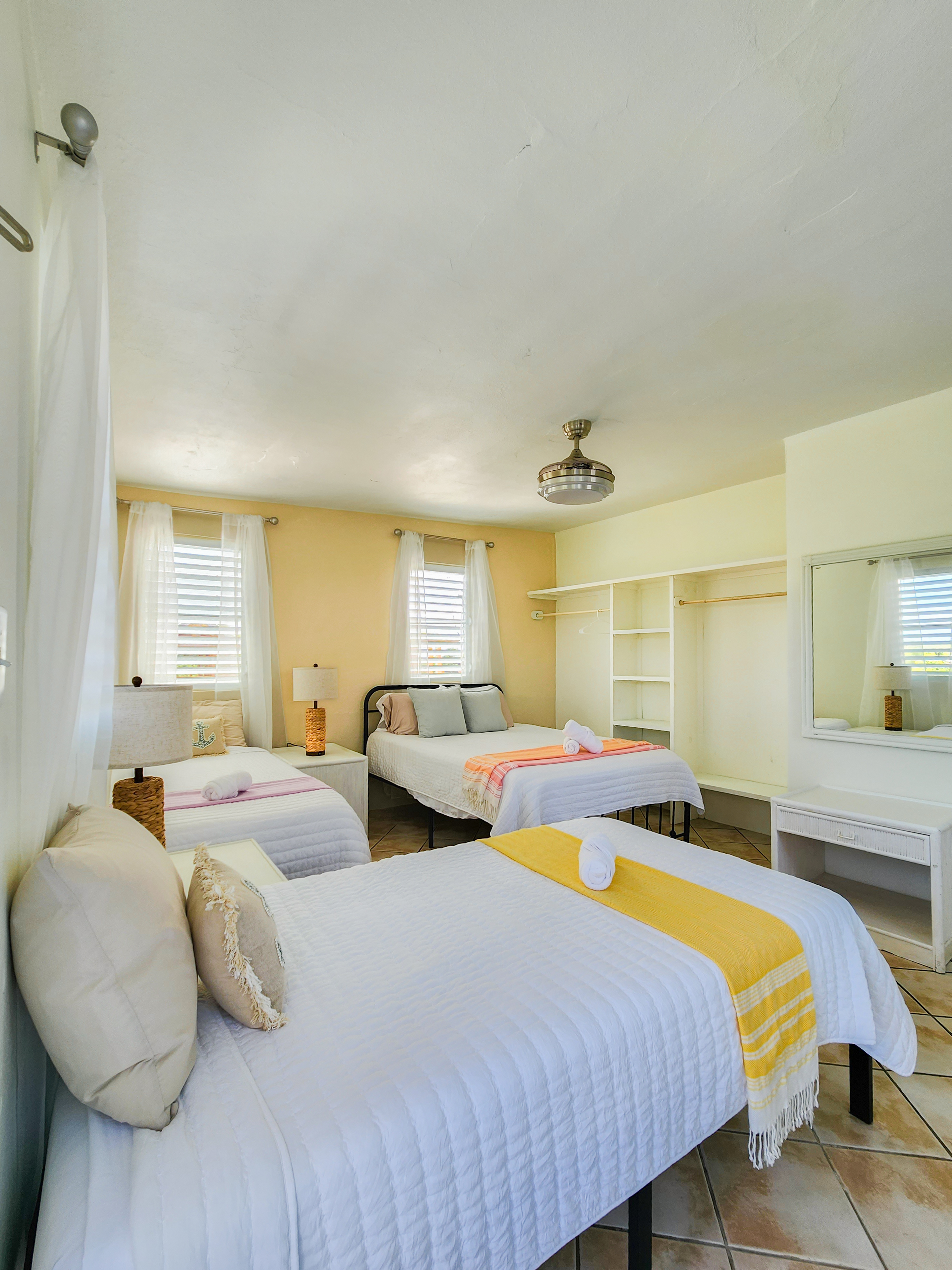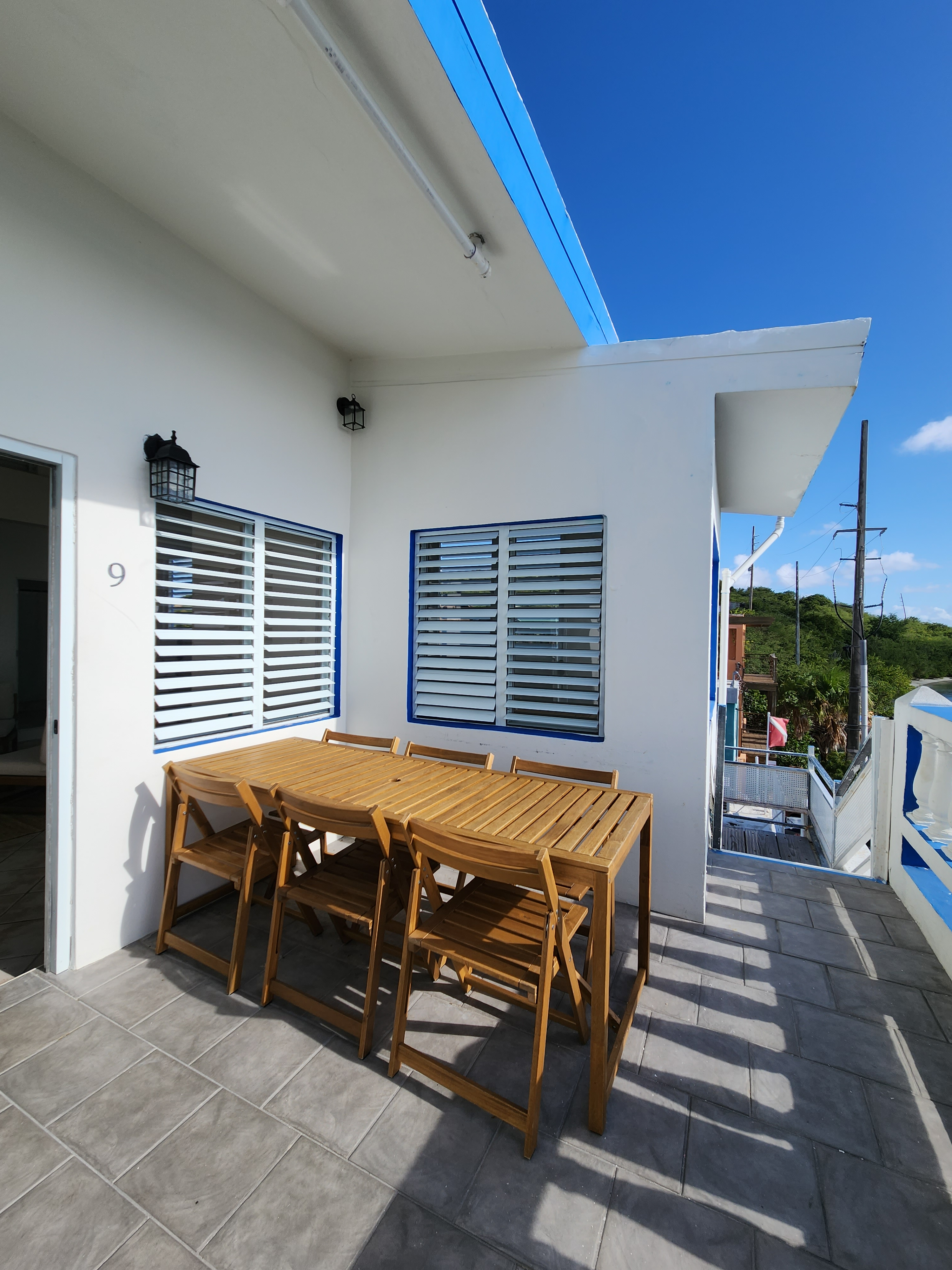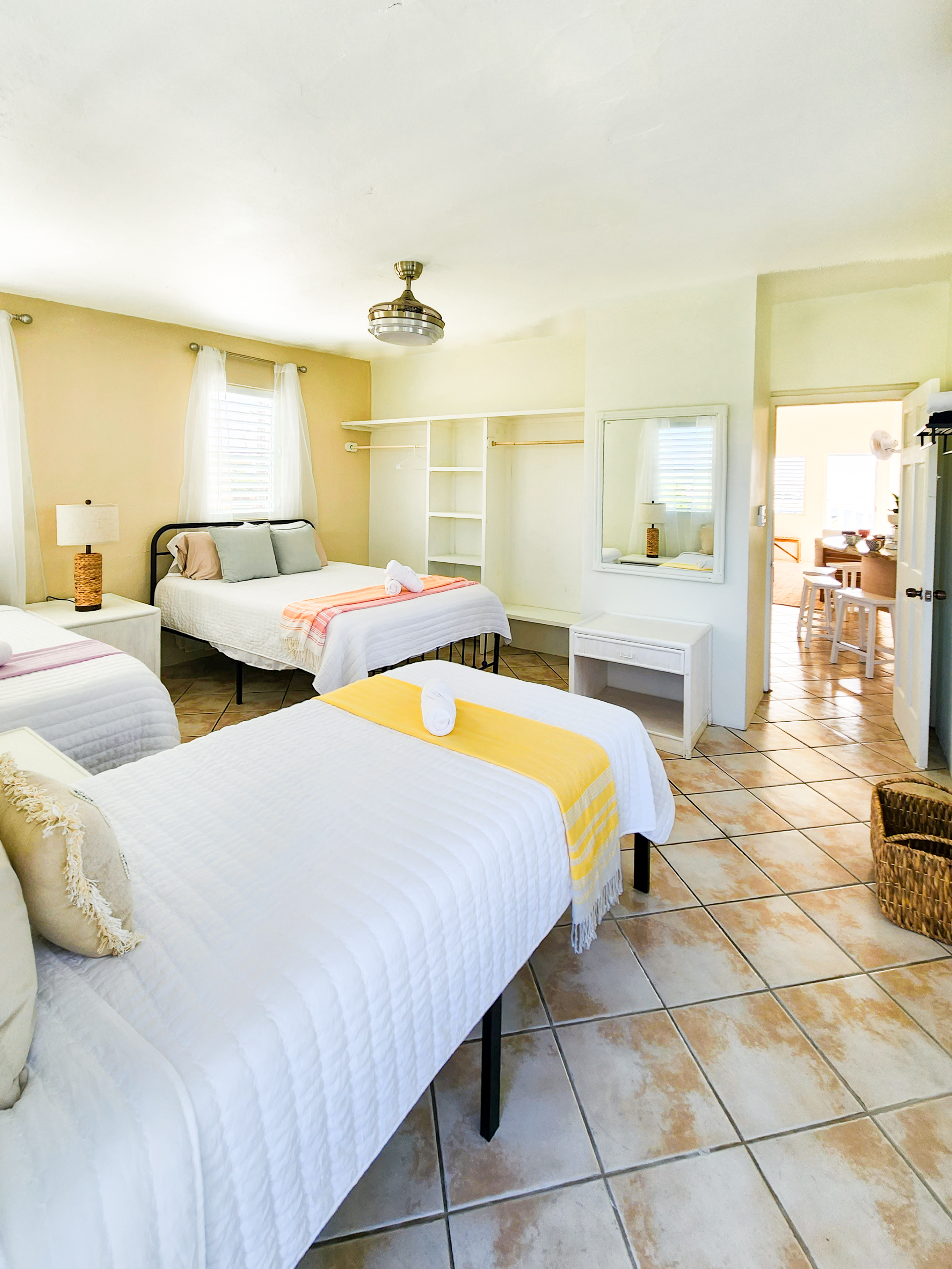 Penthouse Apartment 9 is a spacious suite ideal for larger groups. It features 2 bedrooms, a kitchen, a living area, a full bathroom, a shared terrace with ocean view, and a private balcony with ocean view. The suite sleeps up to 6 adults: 4 between a queen and two twin beds in the first bedroom and 2 in the second bedroom.