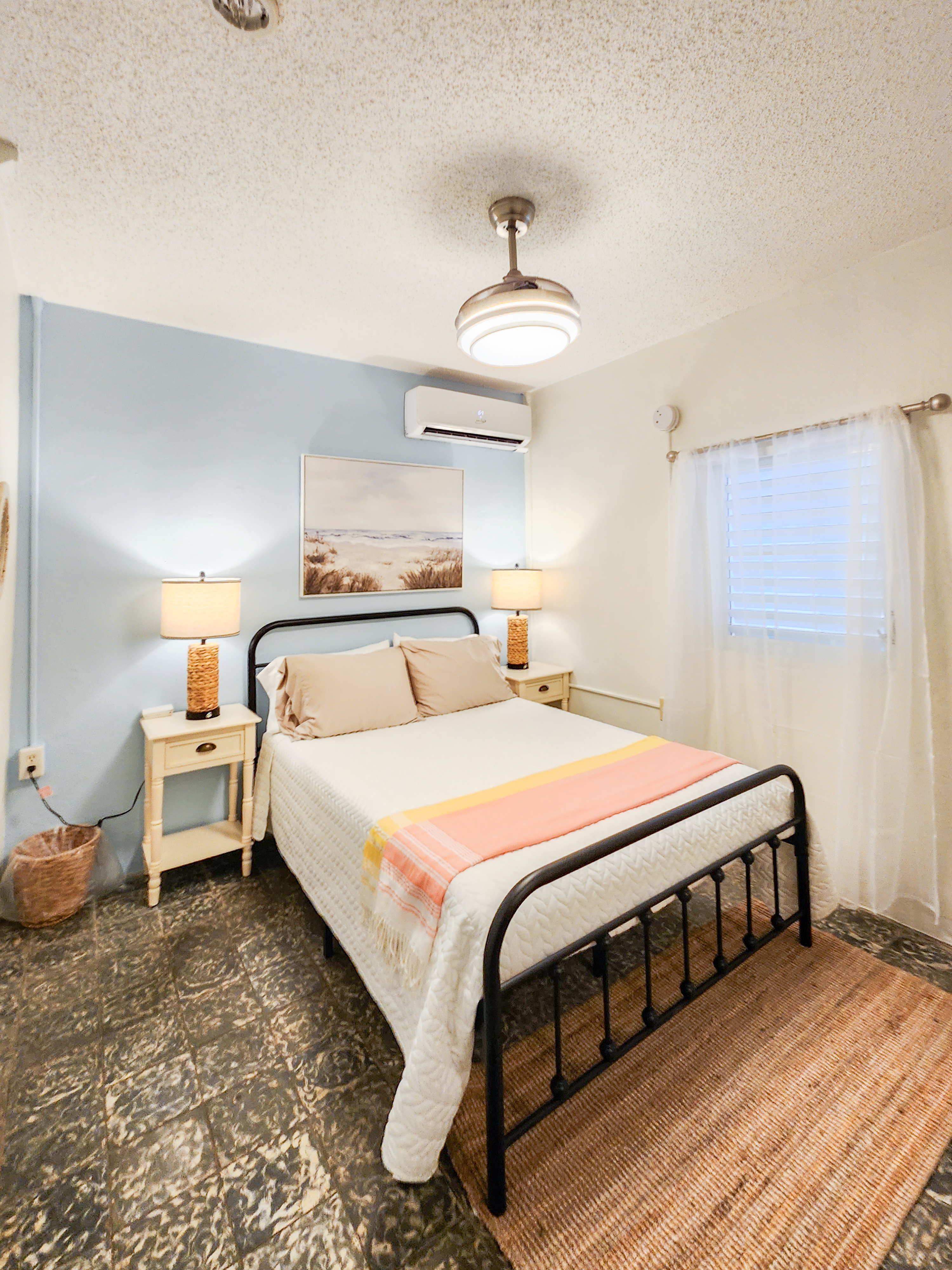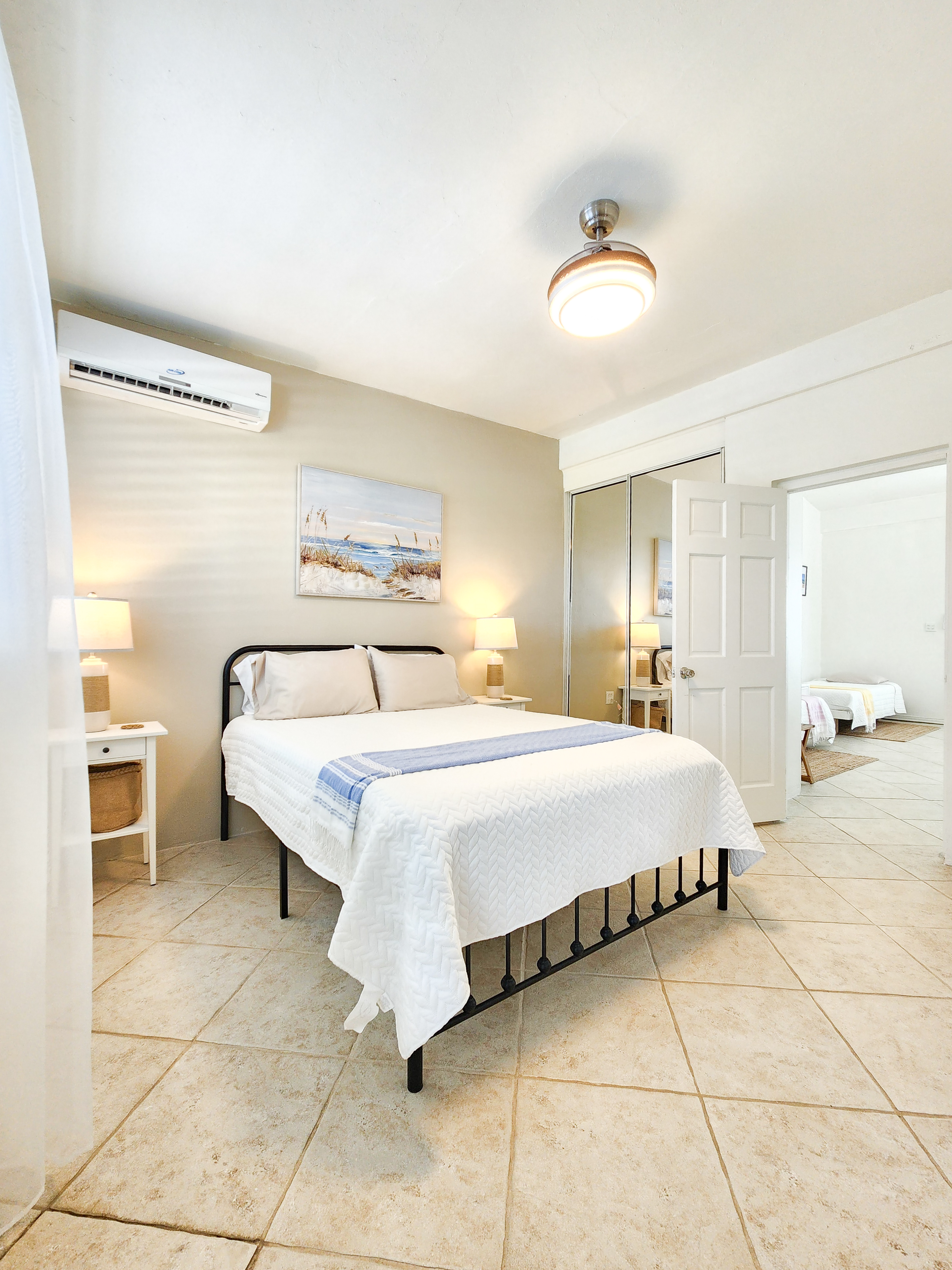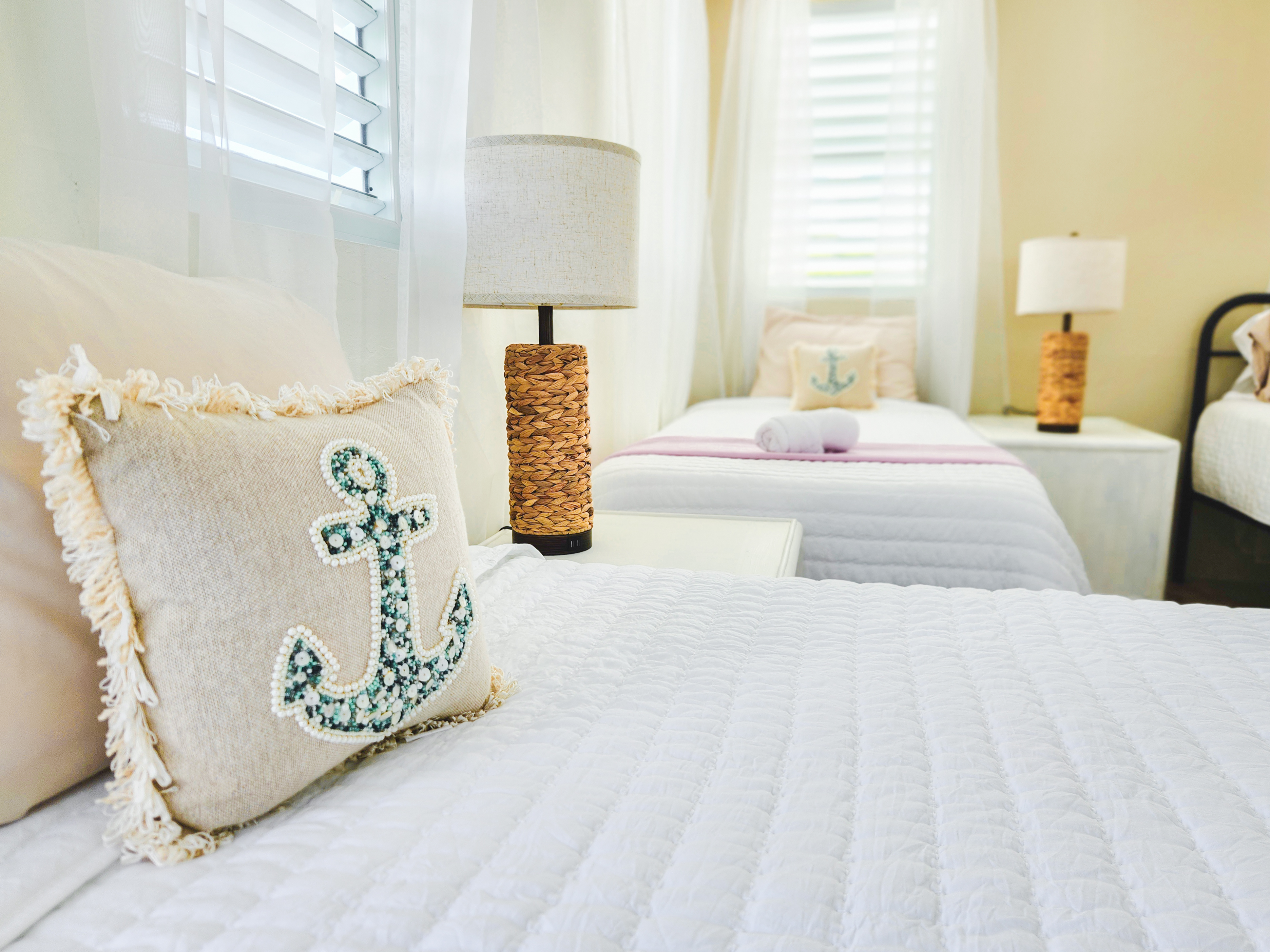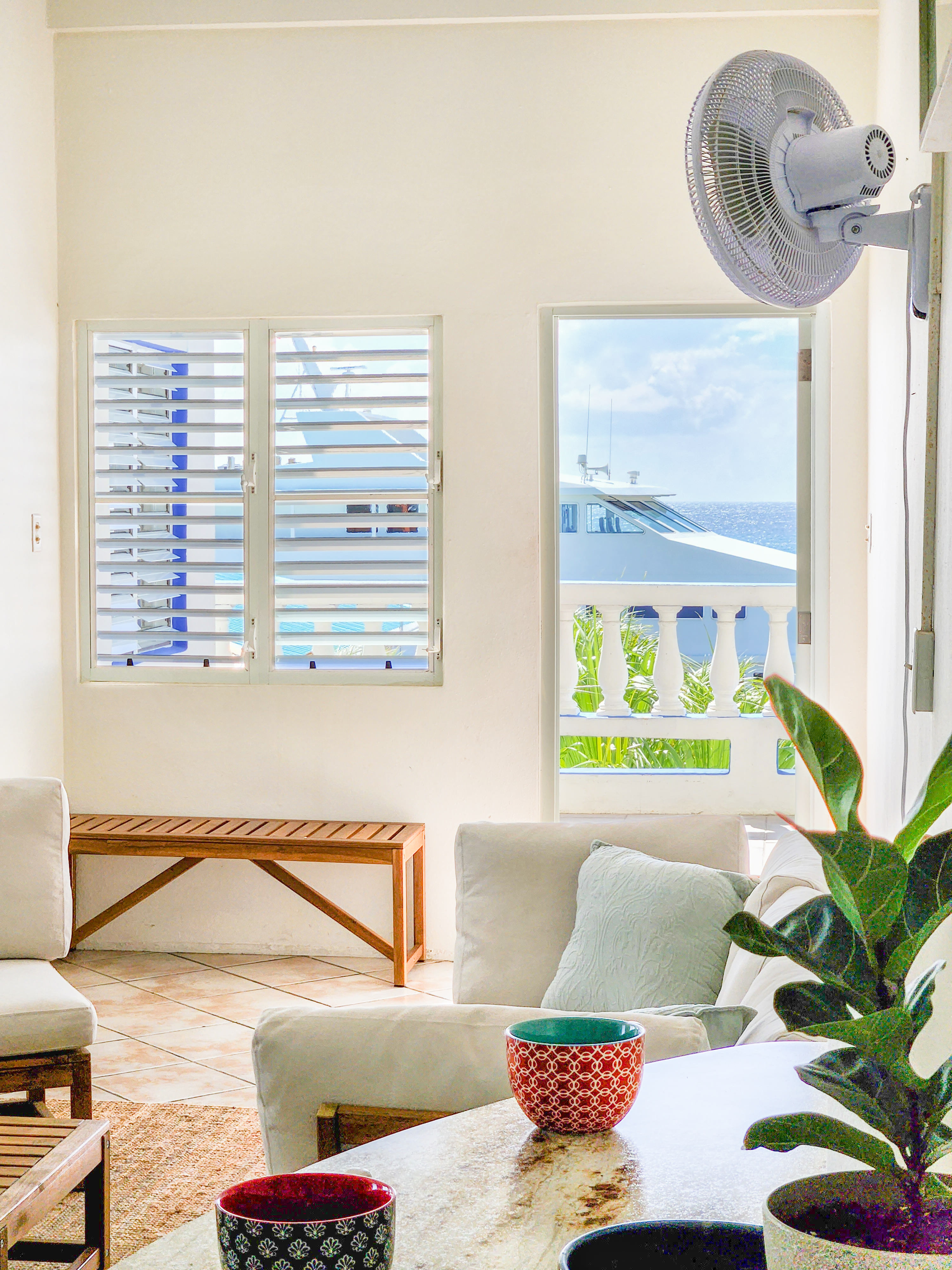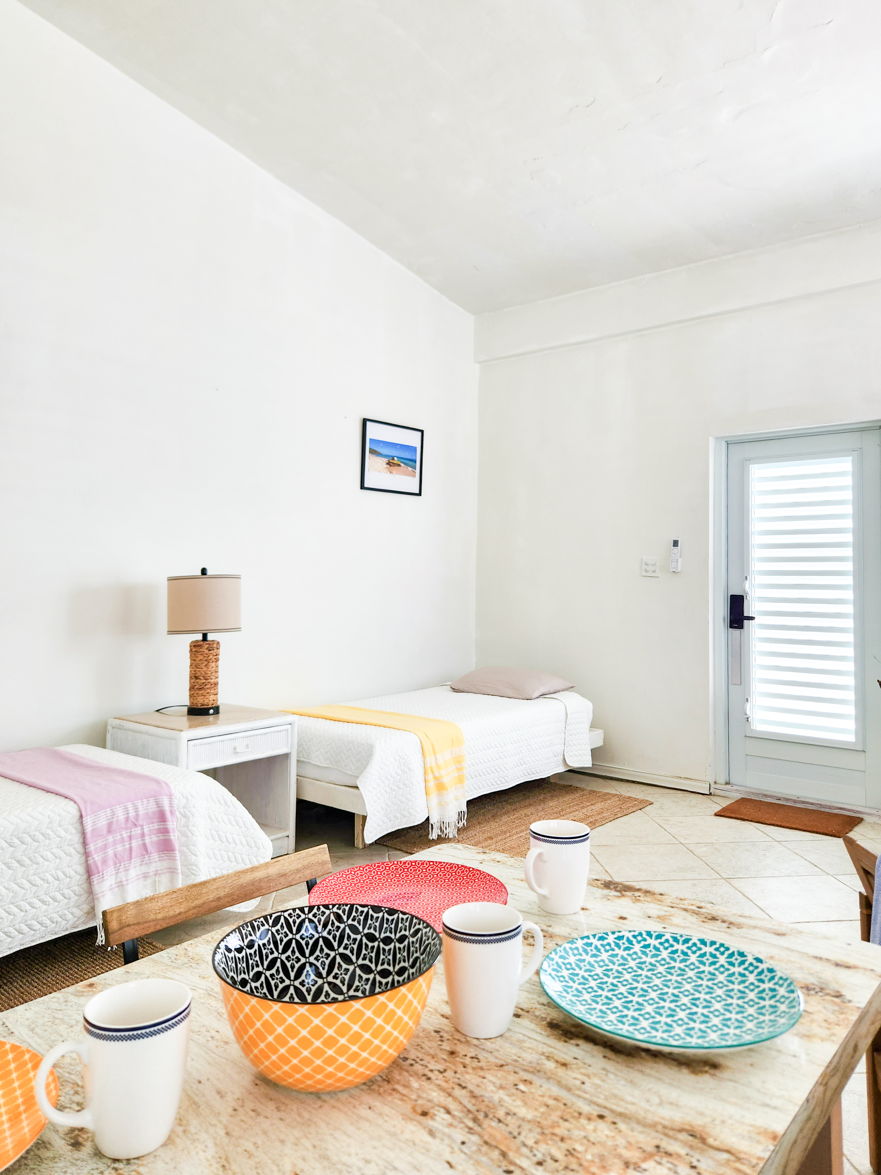 Penthouse Apartment 9 is a spacious suite ideal for larger groups. It features 2 bedrooms, a kitchen, a living area, a full bathroom, a shared terrace with ocean view, and a private balcony with ocean view. The suite sleeps up to 6 adults: 4 between a queen and two twin beds in the first bedroom and 2 in the second bedroom.