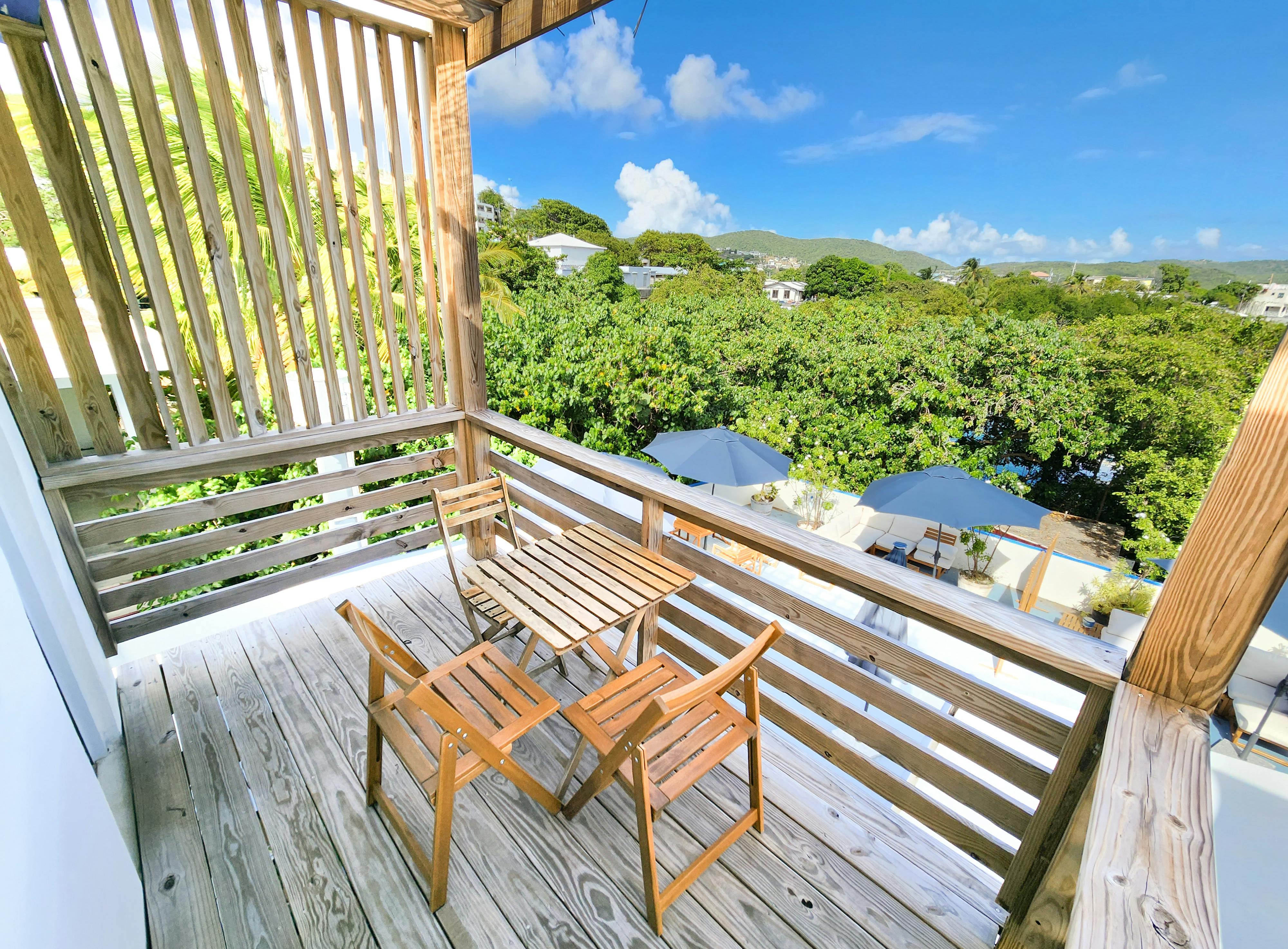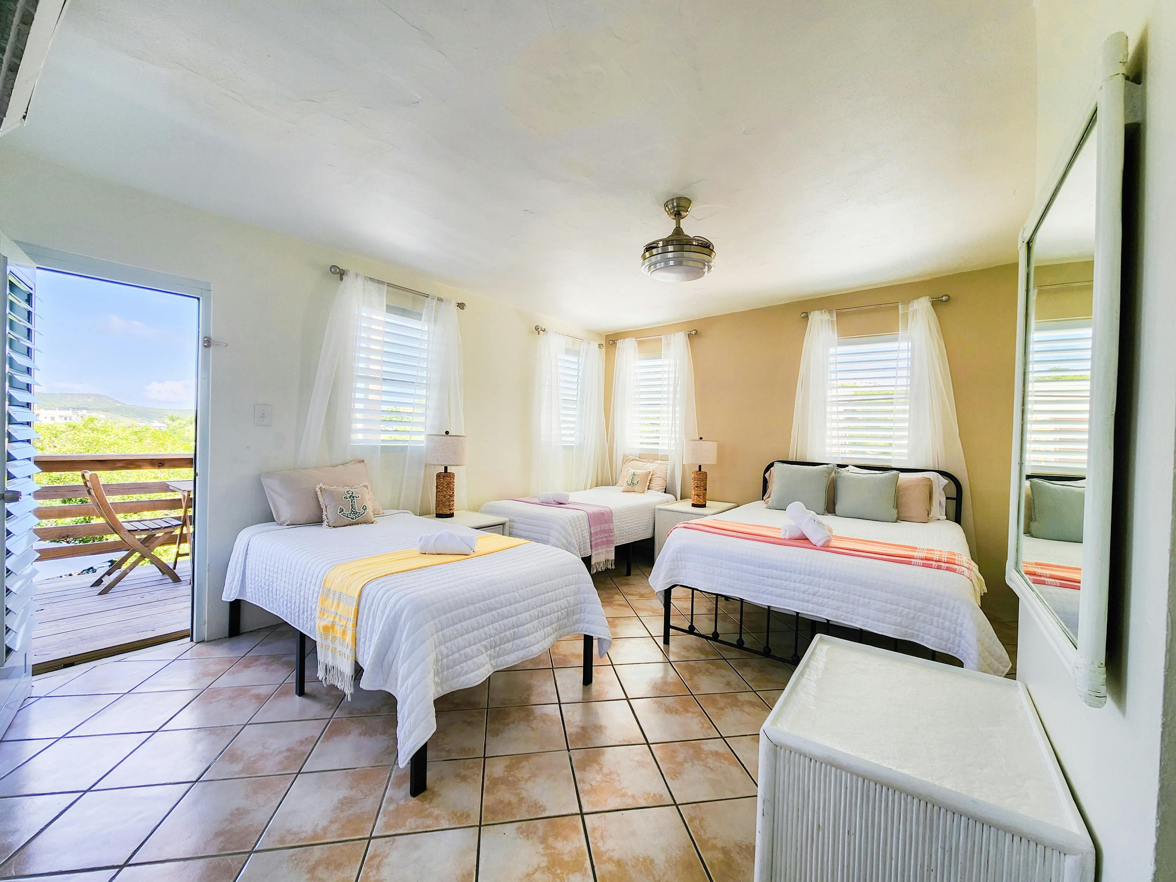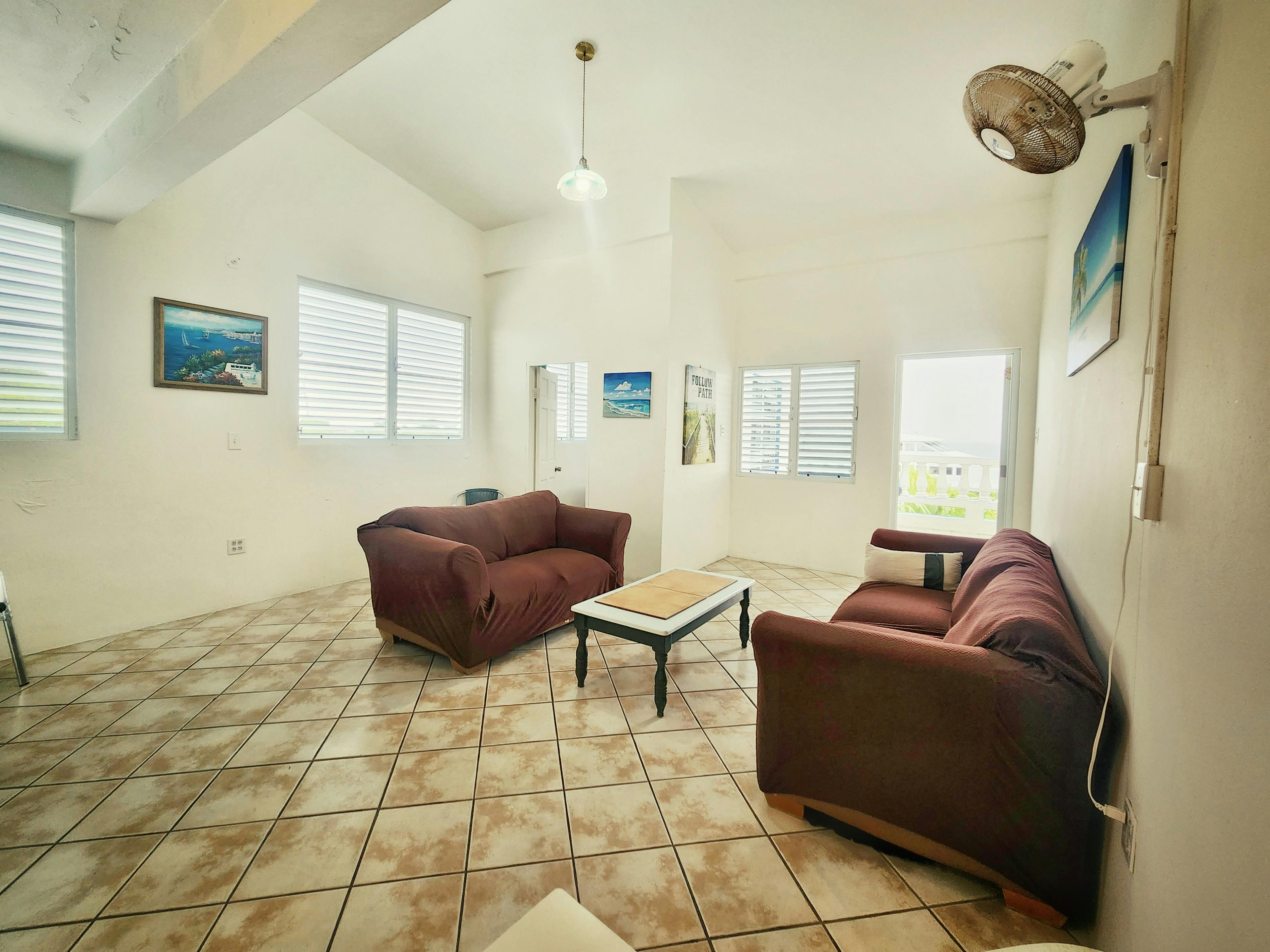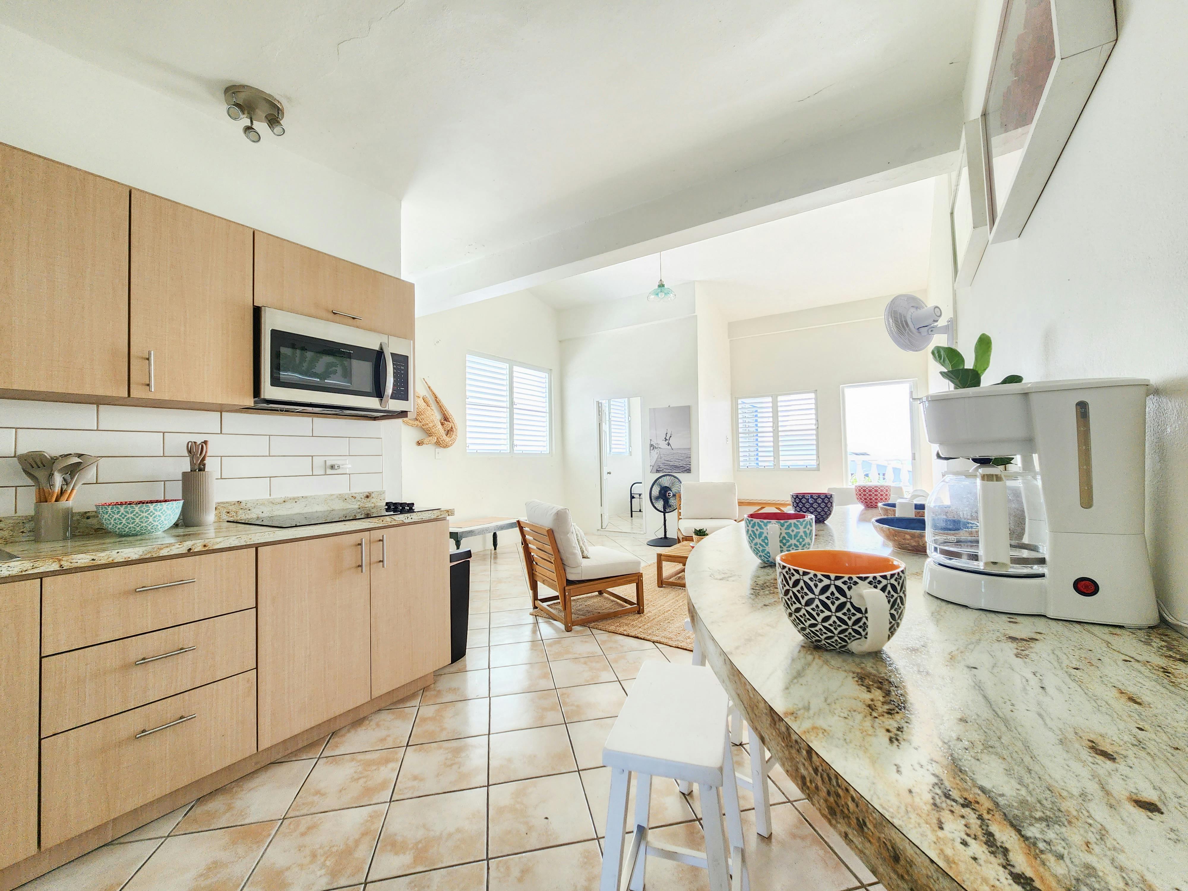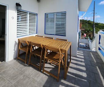 Penthouse Apartment 9 is a spacious suite ideal for larger groups. It features 2 bedrooms, a kitchen, a living area, a full bathroom, a shared terrace with ocean view, and a private balcony with ocean view. The suite sleeps up to 6 adults: 4 between a queen and two twin beds in the first bedroom and 2 in the second bedroom.