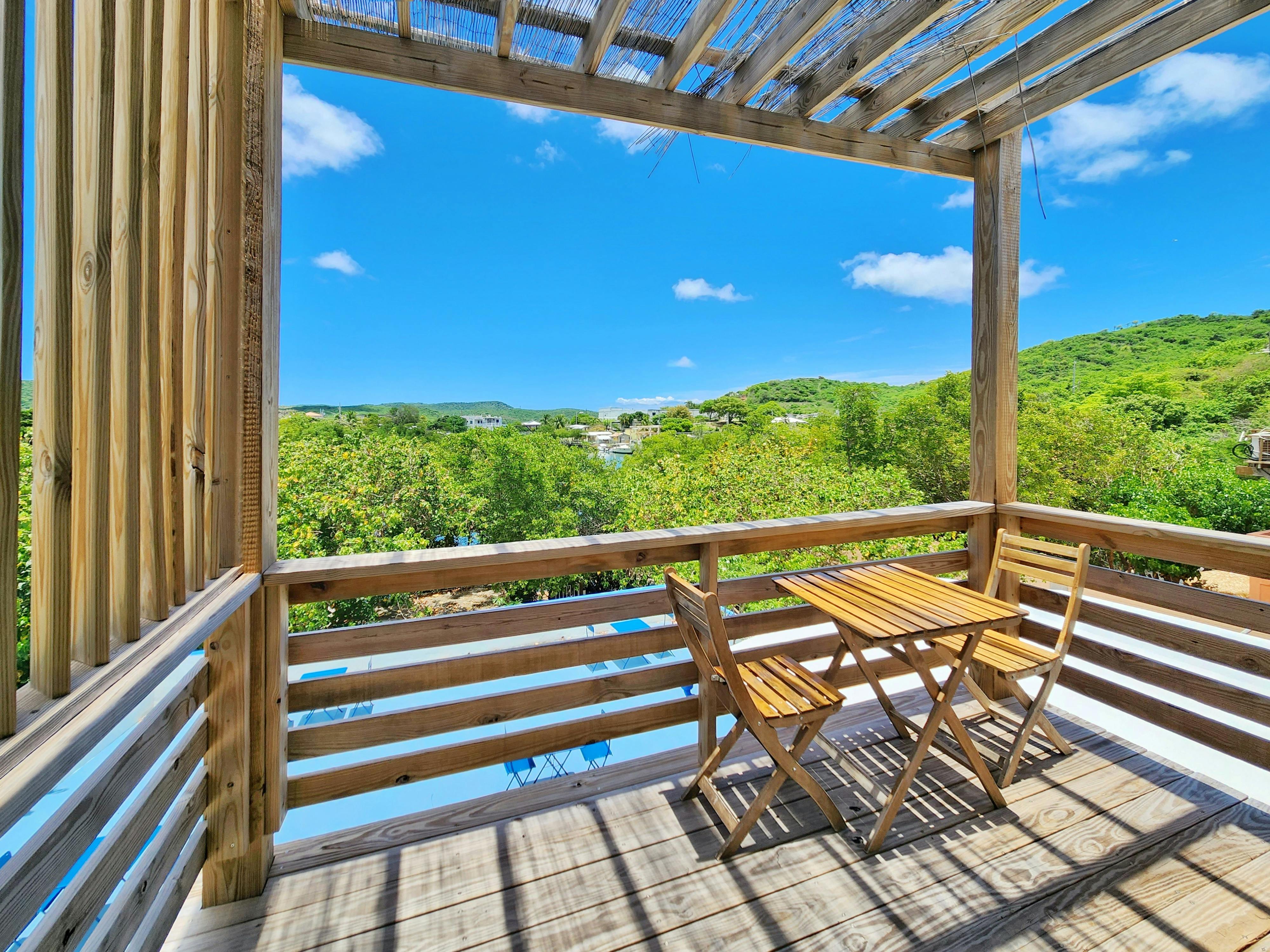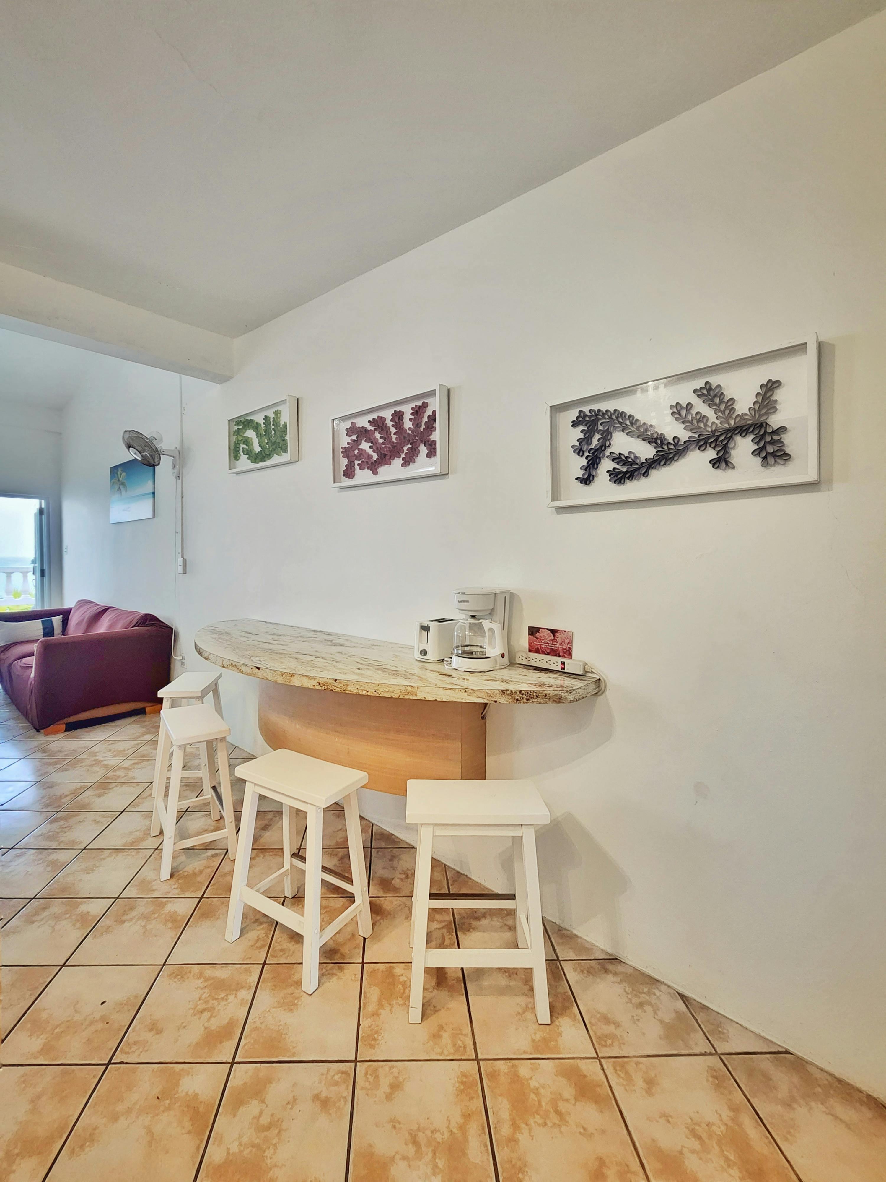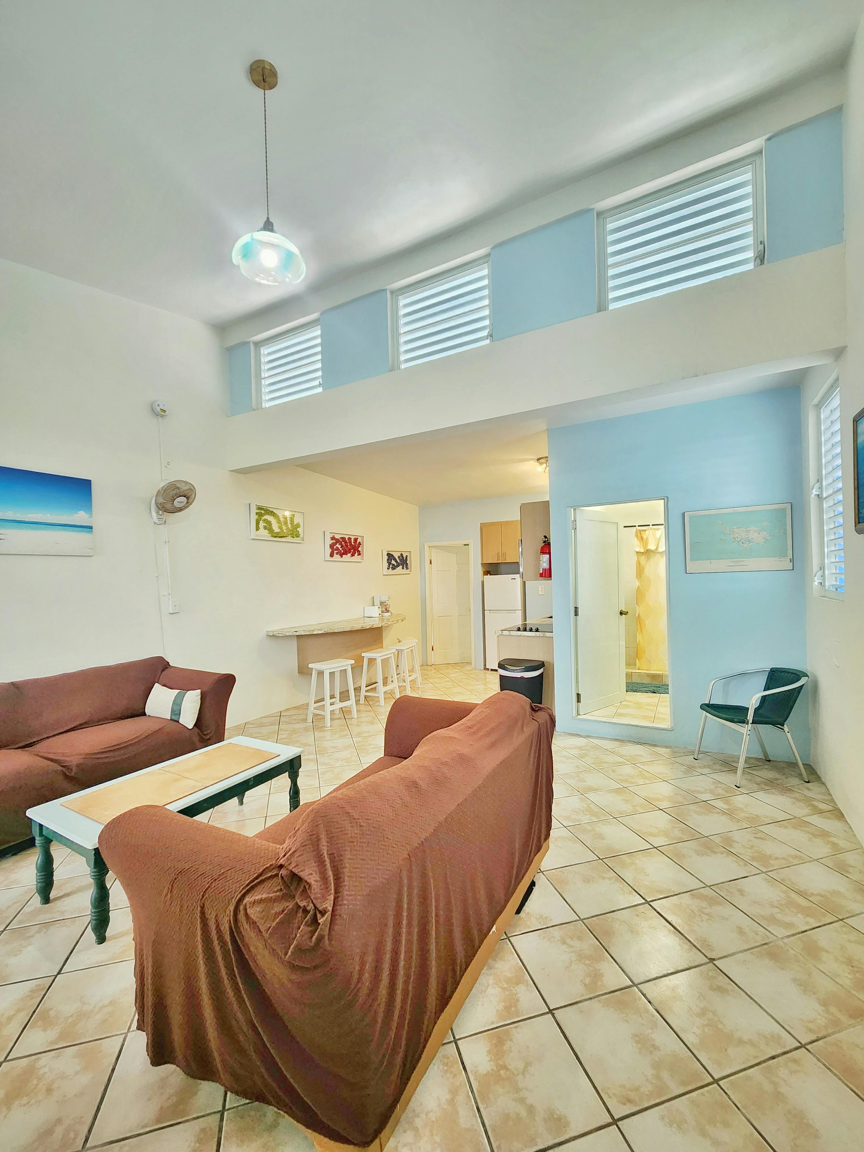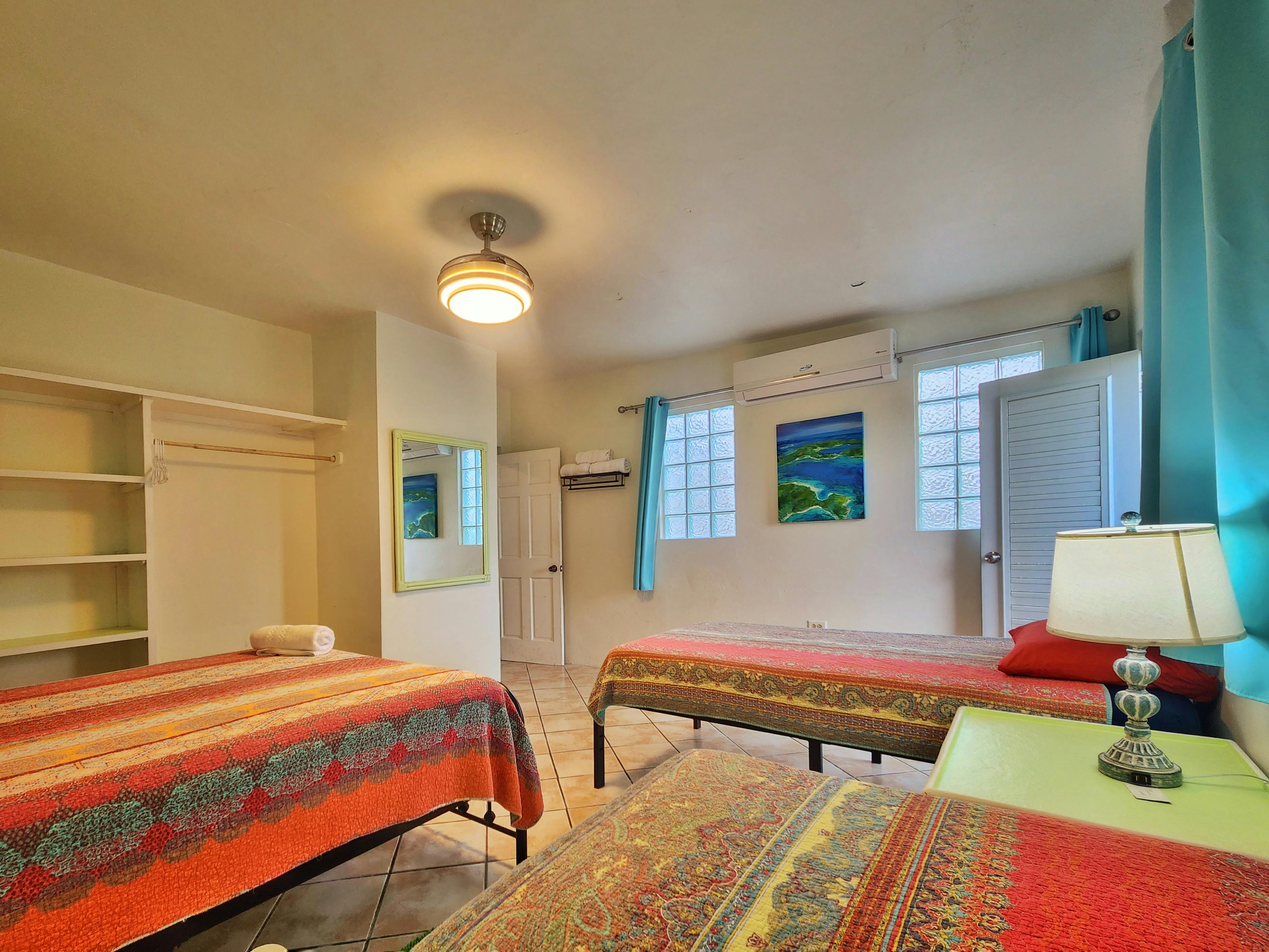 Penthouse Apartment 9 is a spacious suite ideal for larger groups. It features 2 bedrooms, a kitchen, a living area, a full bathroom, a shared terrace with ocean view, and a private balcony with ocean view. The suite sleeps up to 6 adults: 4 between a queen and two twin beds in the first bedroom and 2 in the second bedroom.