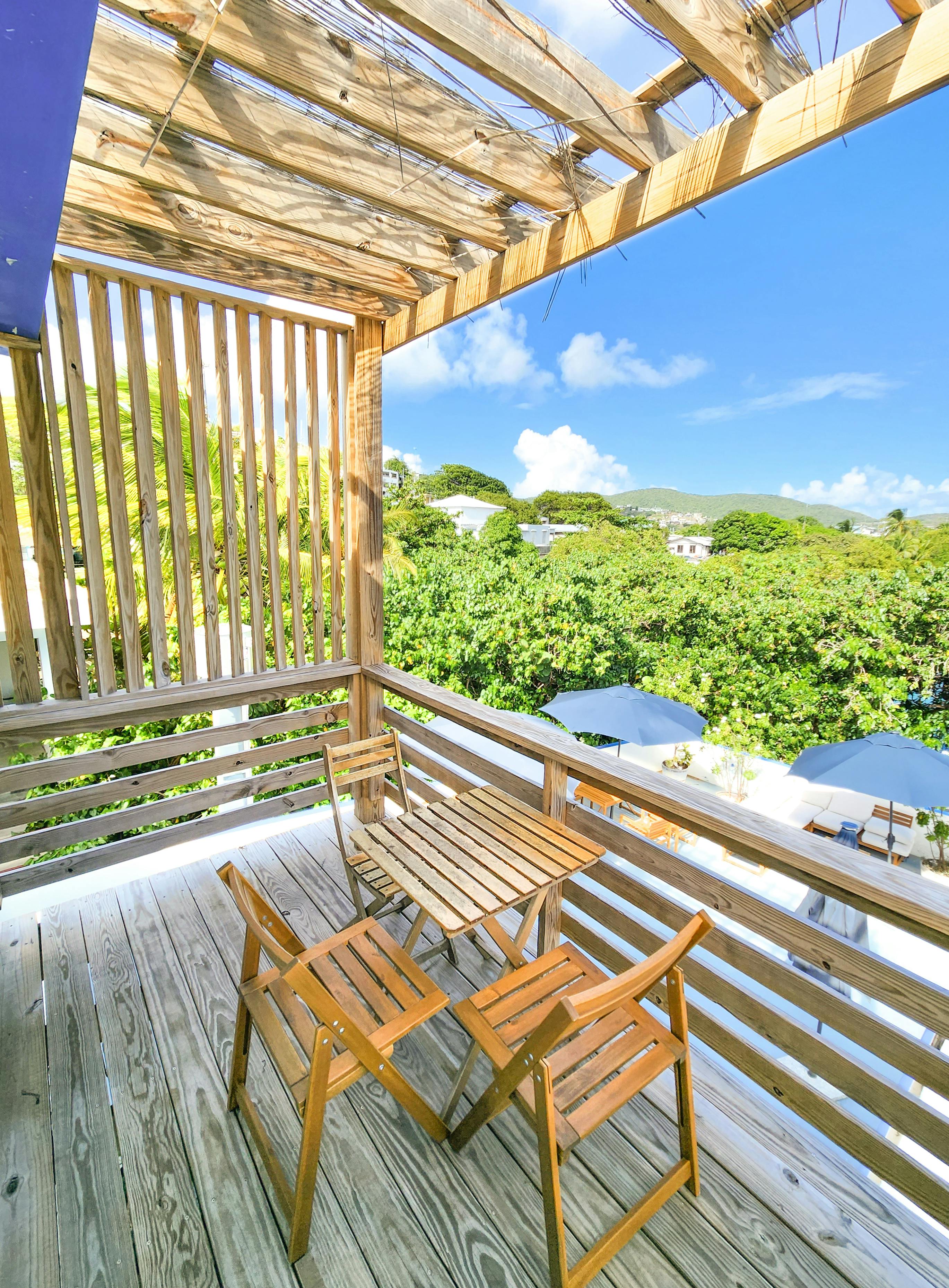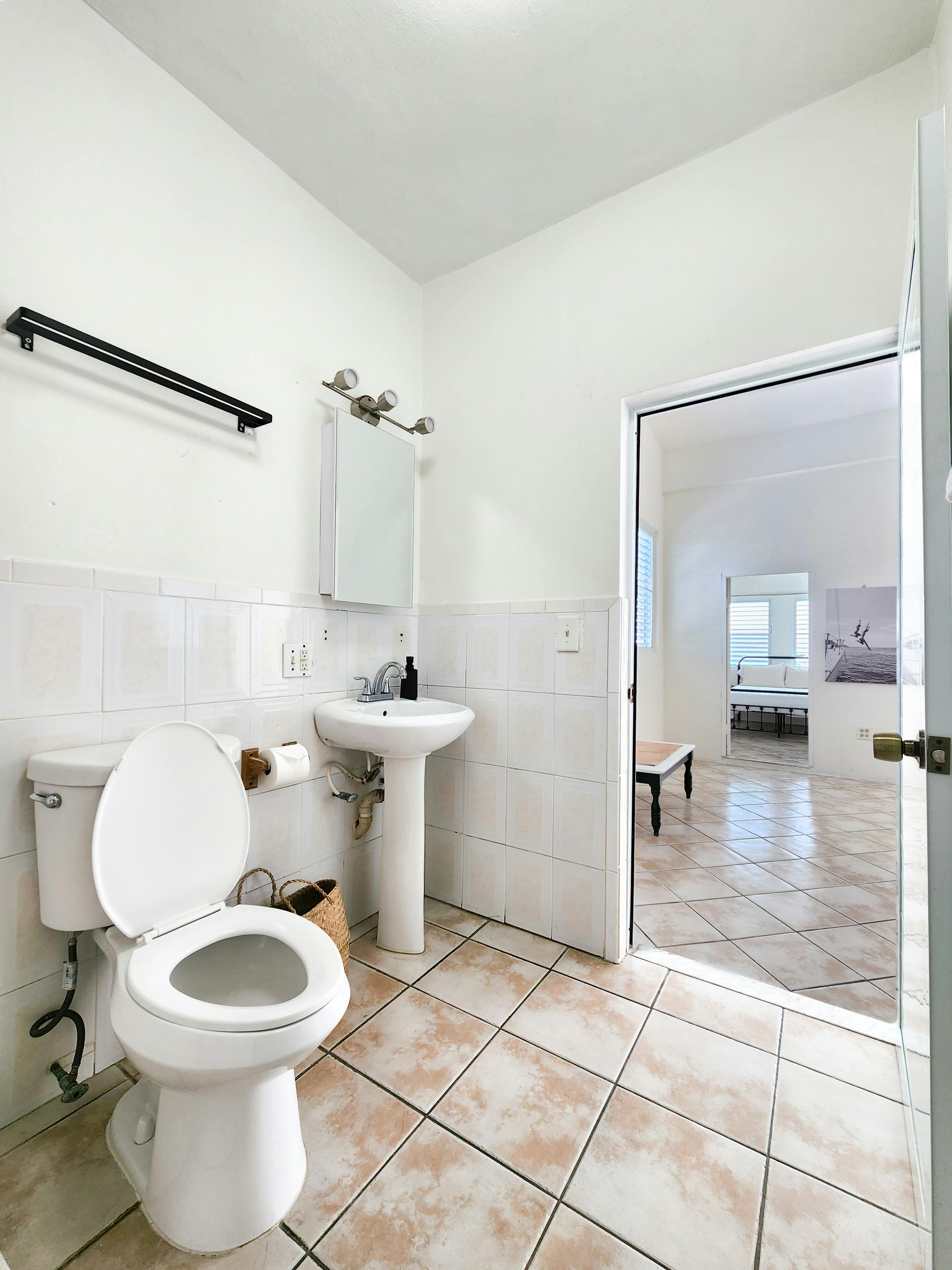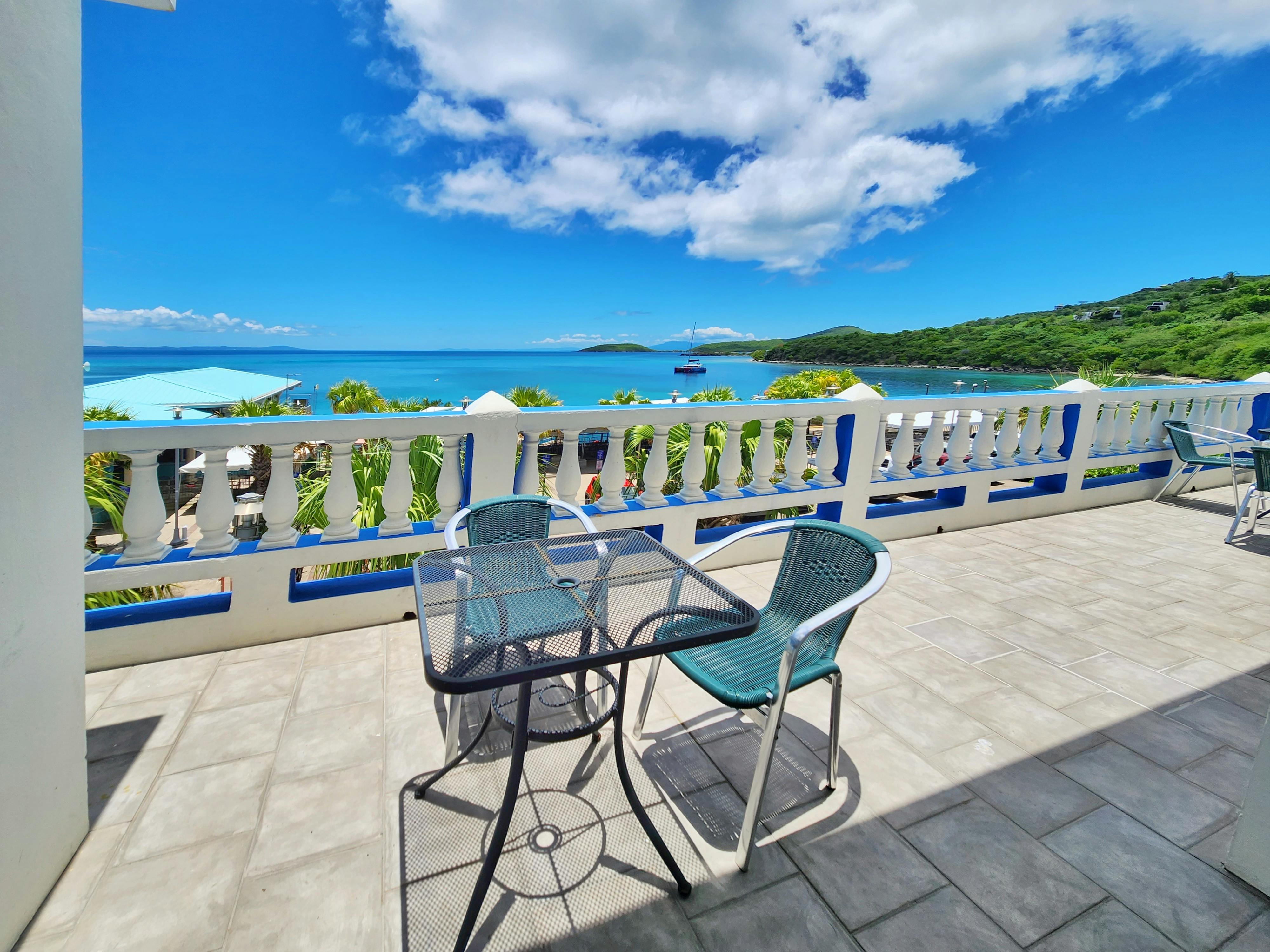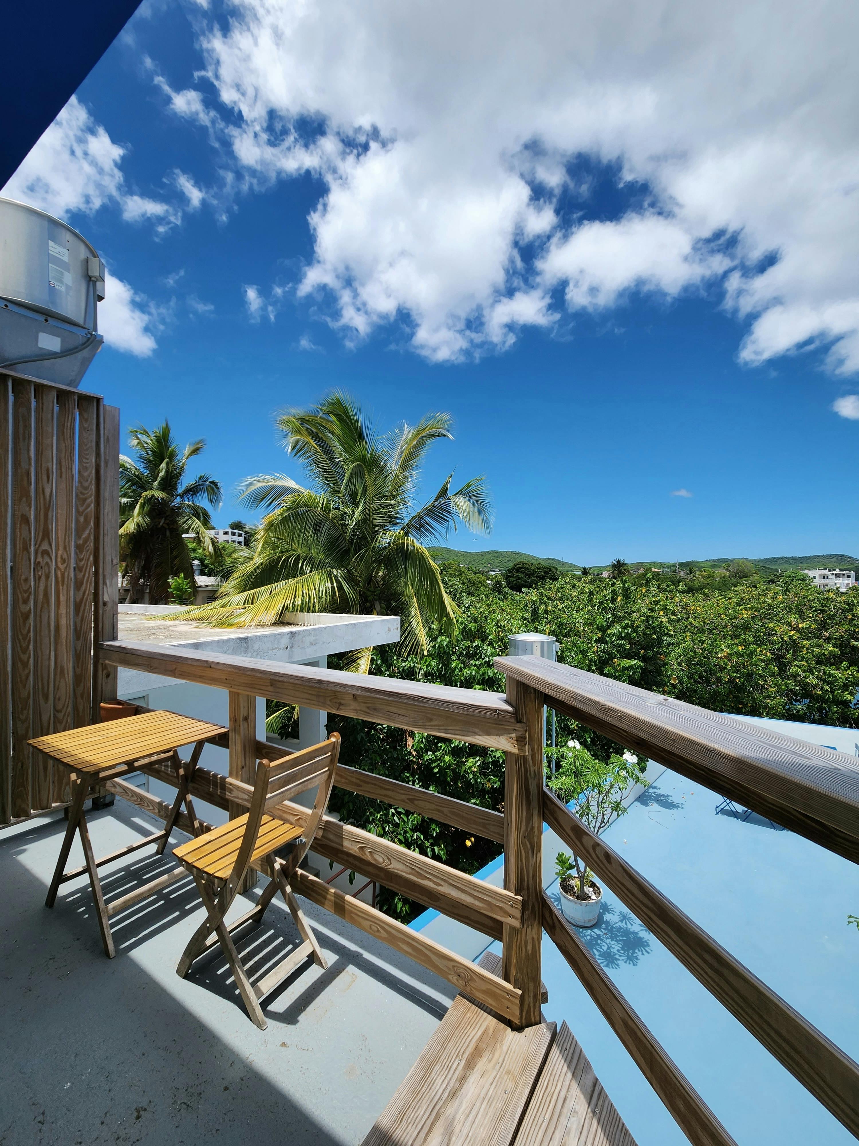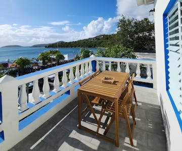 Penthouse Apartment 9 is a spacious suite ideal for larger groups. It features 2 bedrooms, a kitchen, a living area, a full bathroom, a shared terrace with ocean view, and a private balcony with ocean view. The suite sleeps up to 6 adults: 4 between a queen and two twin beds in the first bedroom and 2 in the second bedroom.