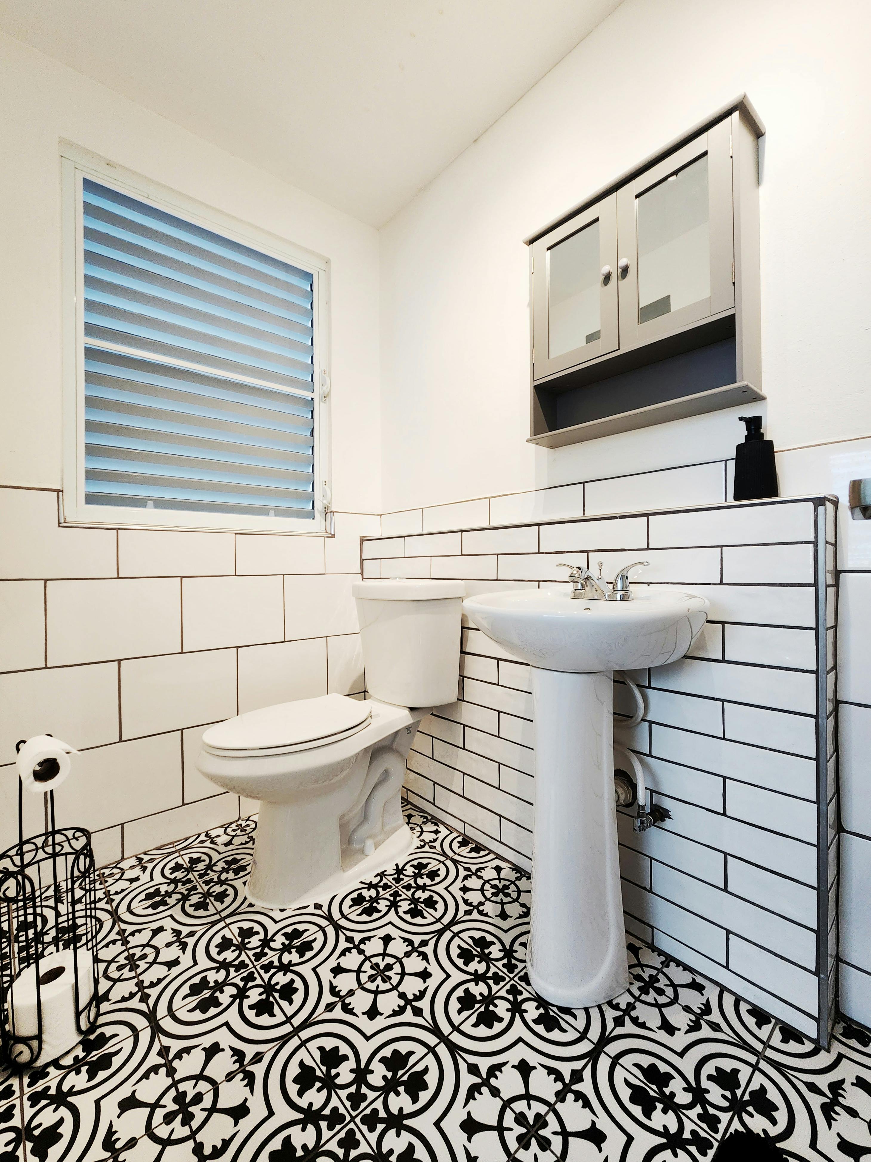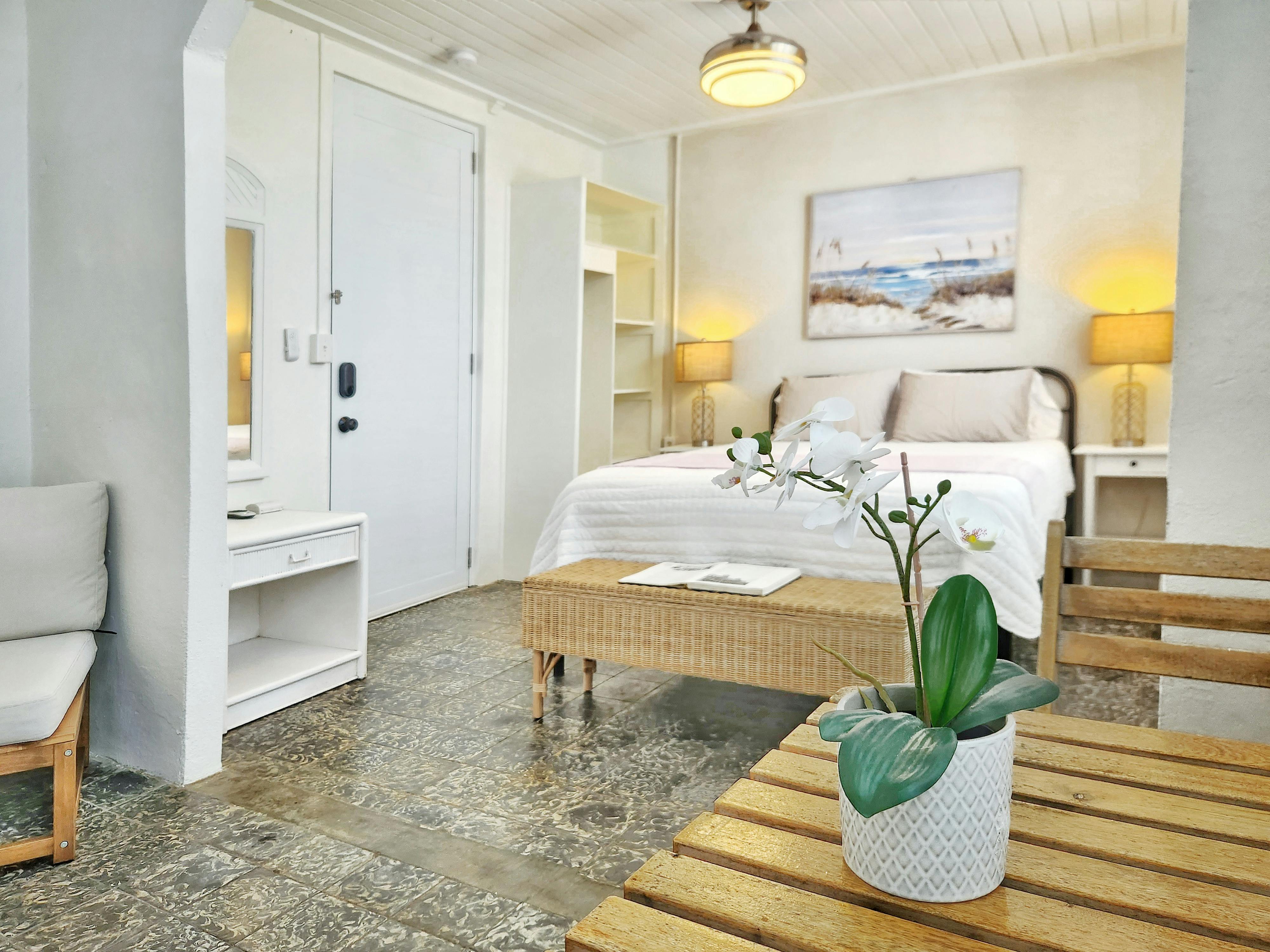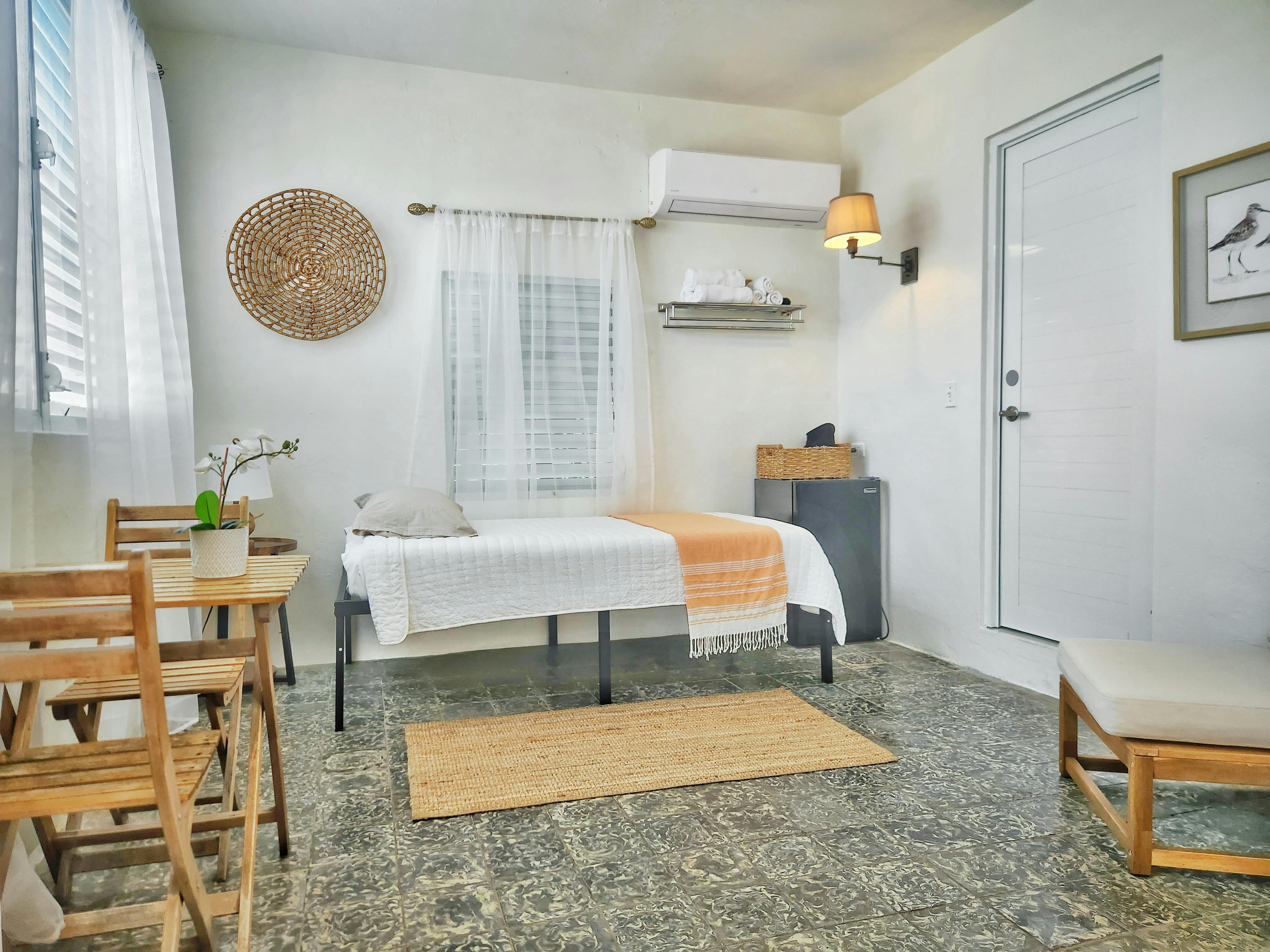 Large room for 3 with a double and a twin bed. A small table and chairs, nightstands, a dresser, and a full en-suite bathroom complete the room.