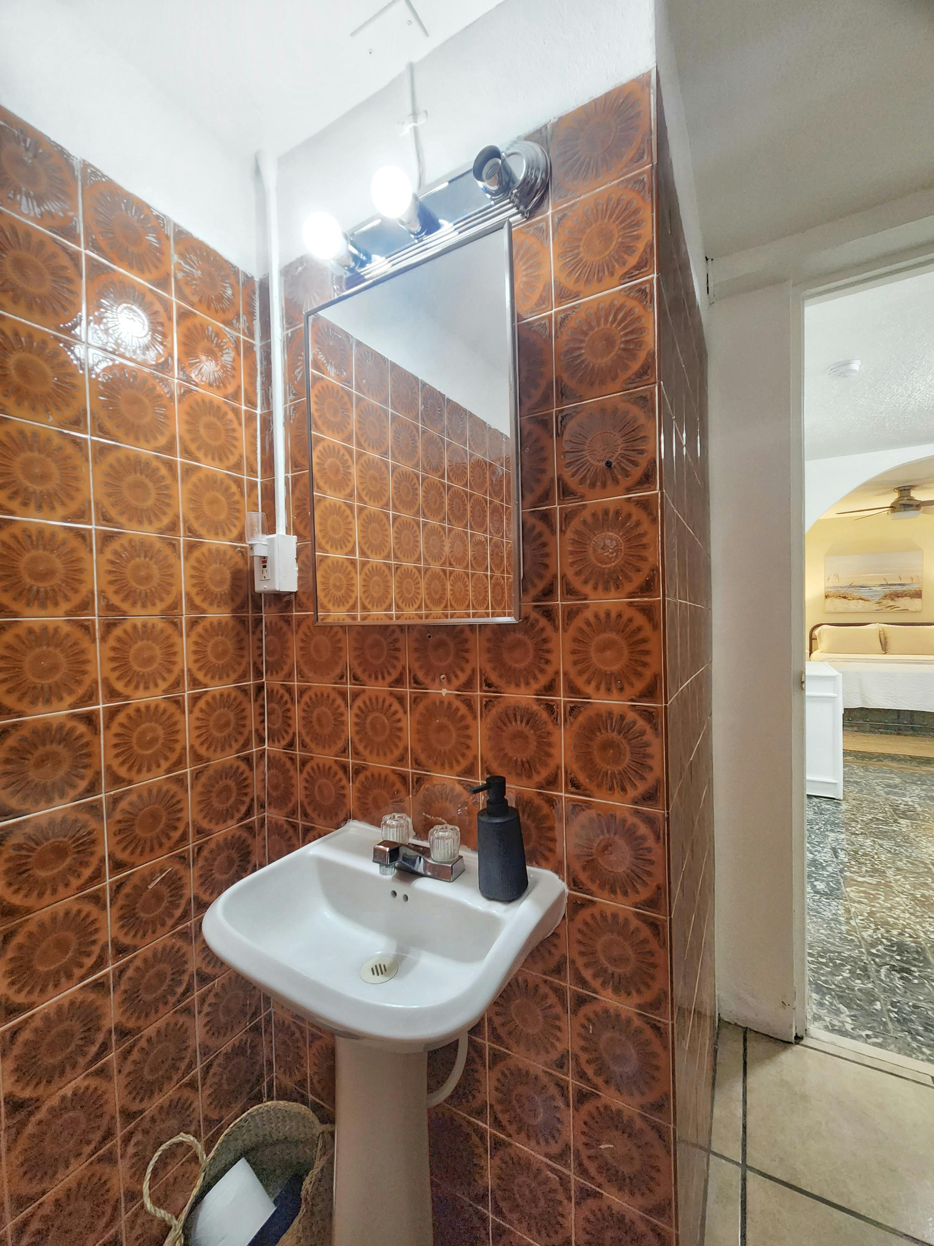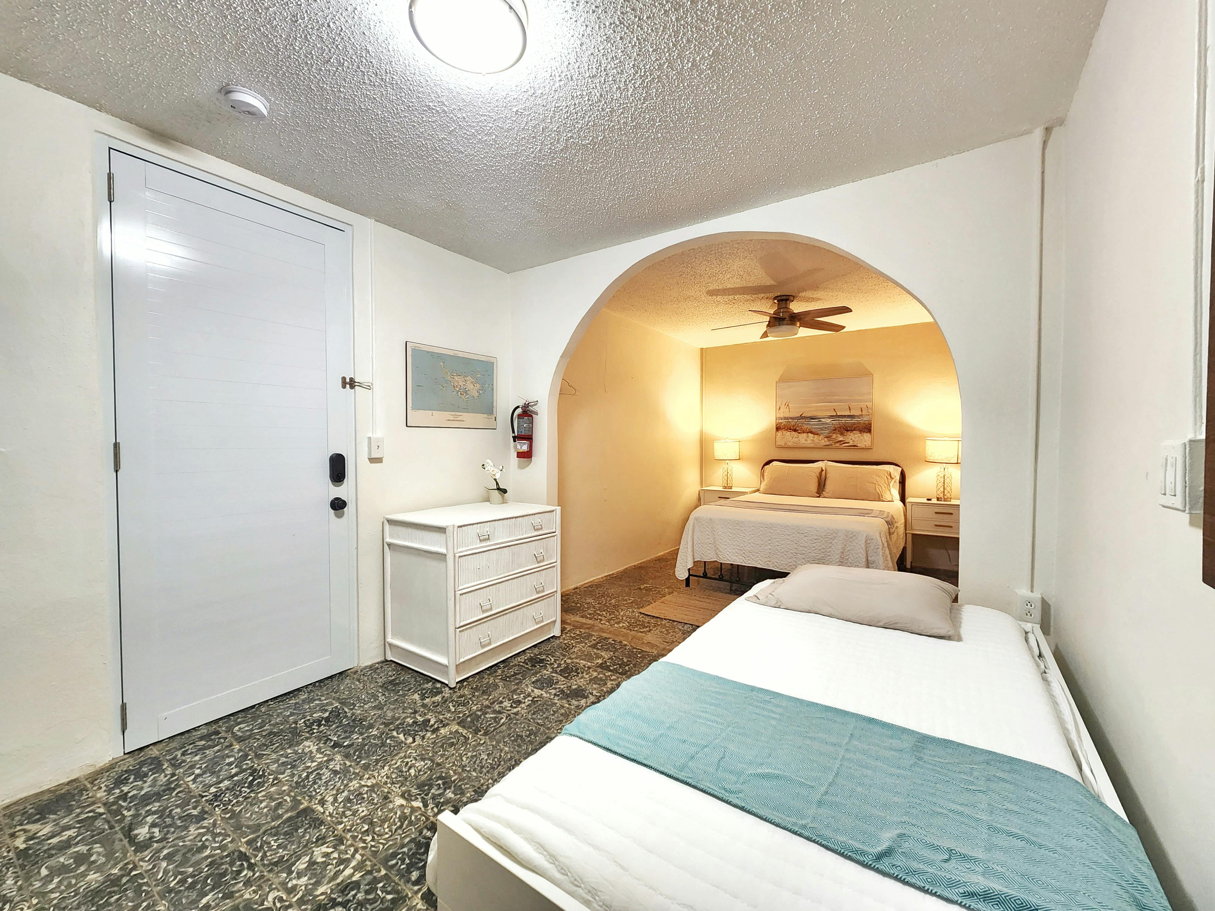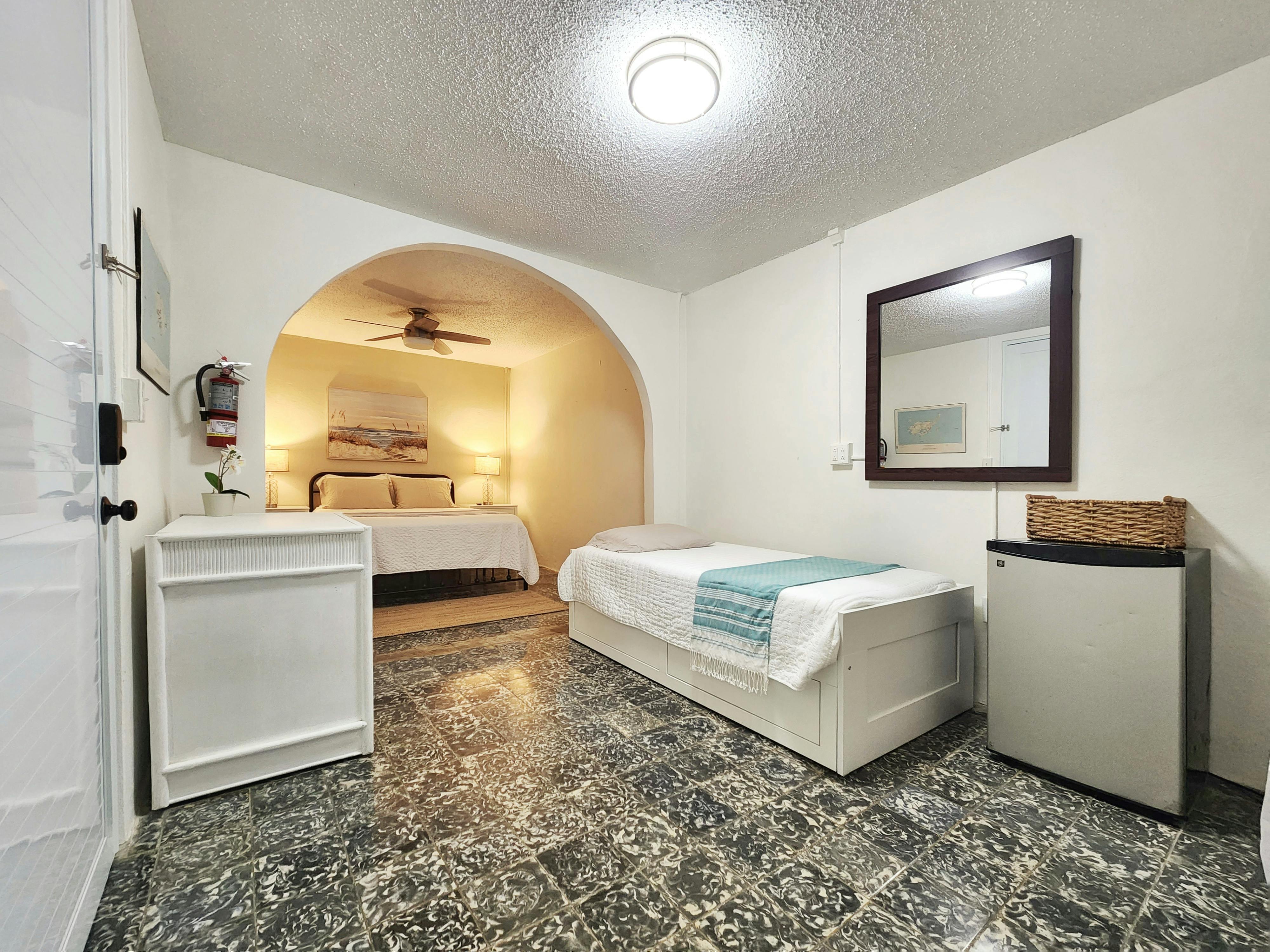 Large room for 3 with a double and a twin bed. A small table and chairs, nightstands, a dresser, and a full en-suite bathroom complete the room.
